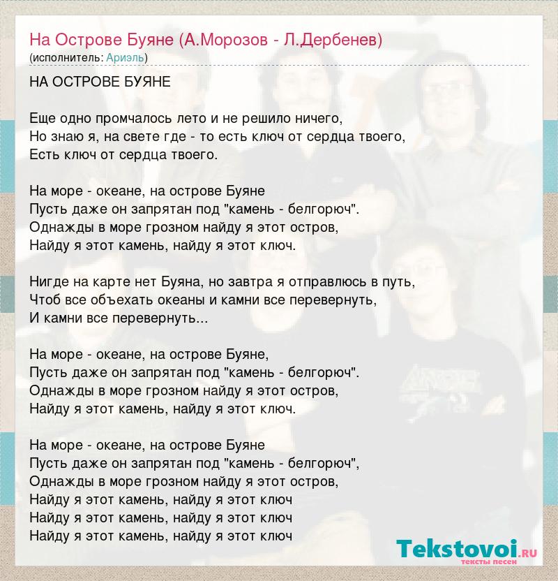 НА ОСТРОВЕ БУЯНЕ Еще одно промчалось лето и не решило ничего, Но знаю я, на свете где - то есть ключ от сердца твоего, Есть ключ от сердца твоего. На море - океане, на острове Буяне Пусть даже он запрятан под "камень - белгорюч". Однажды в море грозном найду я этот остров, Найду я этот камень, найду я этот ключ. Нигде на карте нет Буяна, но завтра я отправлюсь в путь, Чтоб все объехать океаны и камни все перевернуть, И камни все перевернуть... На море - океане, на острове Буяне, Пусть даже он запрятан под "камень - белгорюч". Однажды в море грозном найду я этот остров, Найду я этот камень, найду я этот ключ. На море - океане, на острове Буяне Пусть даже он запрятан под "камень - белгорюч", Однажды в море грозном найду я этот остров, Найду я этот камень, найду я этот ключ Найду я этот камень, найду я этот ключ Найду я этот камень, найду я этот ключ