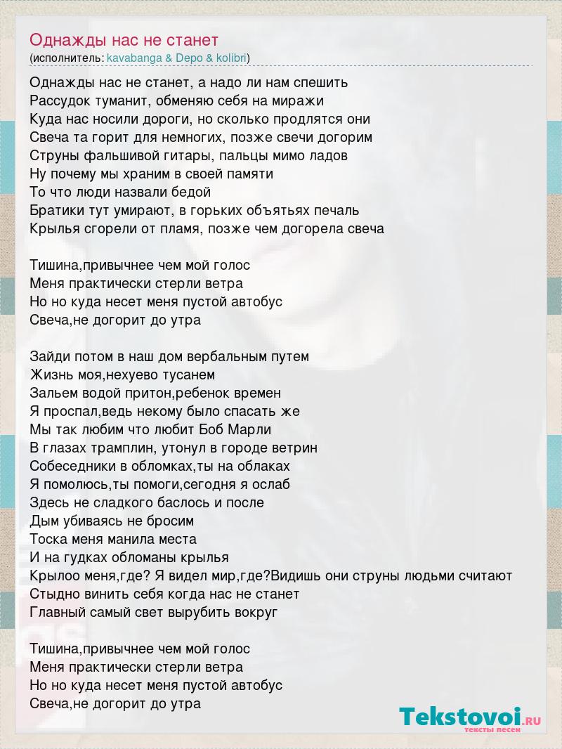 Однажды нас не станет, а надо ли нам спешить Рассудок туманит, обменяю себя на миражи Куда нас носили дороги, но сколько продлятся они Свеча та горит для немногих, позже свечи догорим Струны фальшивой гитары, пальцы мимо ладов Ну почему мы храним в своей памяти То что люди назвали бедой Братики тут умирают, в горьких объятьях печаль Крылья сгорели от пламя, позже чем догорела свеча Тишина,привычнее чем мой голос Меня практически стерли ветра Но но куда несет меня пустой автобус Свеча,не догорит до утра Зайди потом в наш дом вербальным путем Жизнь моя,нехуево тусанем Зальем водой притон,ребенок времен Я проспал,ведь некому было спасать же Мы так любим что любит Боб Марли В глазах трамплин, утонул в городе ветрин Собеседники в обломках,ты на облаках Я помолюсь,ты помоги,сегодня я ослаб Здесь не сладкого баслось и после Дым убиваясь не бросим Тоска меня манила места И на гудках обломаны крылья Крылоо меня,где? Я видел мир,где?Видишь они струны людьми считают Стыдно винить себя когда нас не станет Главный самый свет вырубить вокруг Тишина,привычнее чем мой голос Меня практически стерли ветра Но но куда несет меня пустой автобус Свеча,не догорит до утра