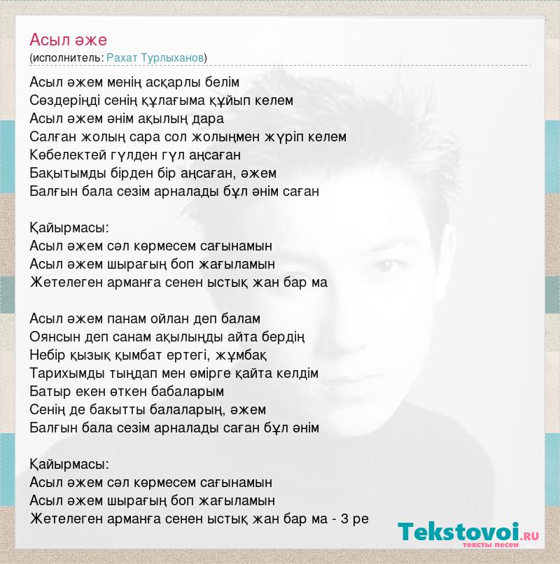 Асыл әжем менің асқарлы белім Сөздеріңді сенің құлағыма құйып келем Асыл әжем әнім ақылың дара Салған жолың сара сол жолыңмен жүріп келем Көбелектей гүлден гүл аңсаған Бақытымды бірден бір аңсаған, әжем Балғын бала сезім арналады бұл әнім саған Қайырмасы: Асыл әжем сәл көрмесем сағынамын Асыл әжем шырағың боп жағыламын Жетелеген арманға сенен ыстық жан бар ма Асыл әжем панам ойлан деп балам Оянсын деп санам ақылыңды айта бердің Небір қызық қымбат ертегі, жұмбақ Тарихымды тыңдап мен өмірге қайта келдім Батыр екен өткен бабаларым Сенің де бакытты балаларың, әжем Балғын бала сезім арналады саған бұл әнім Қайырмасы: Асыл әжем сәл көрмесем сағынамын Асыл әжем шырағың боп жағыламын Жетелеген арманға сенен ыстық жан бар ма - 3 ре