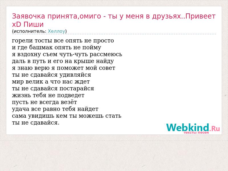 А как ты думаешь, о чем песня "Заявочка принята,омиго - ты у меня в друзьях..Привеет xD Пиши" ?