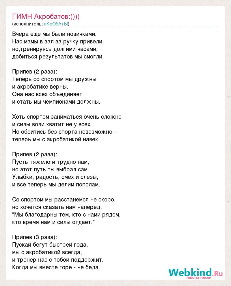 Вчера еще мы были новичками. Нас мамы в зал за ручку привели, но,тренируясь долгими часами, добиться результатов мы смогли. Припев (2 раза): Теперь со спортом мы дружны и акробатике верны. Она нас всех объединяет и стать мы чемпионами должны. Хоть спортом заниматься очень сложно и силы воли хватит не у всех. Но обойтись без спорта невозможно - теперь мы с акробатикой навек. Припев (2 раза): Пусть тяжело и трудно нам, но этот путь ты выбрал сам. Улыбки, радость, смех и слезы, и все теперь мы делим пополам. Со спортом мы расстанемся не скоро, но хочется сказать нам наперед: "Мы благодарны тем, кто с нами рядом, кто время нам и силы отдает." Припев (3 раза): Пускай бегут быстрей года, мы с акробатикой всегда, и тренер нас с тобой поддержит. Когда мы вместе горе - не беда.