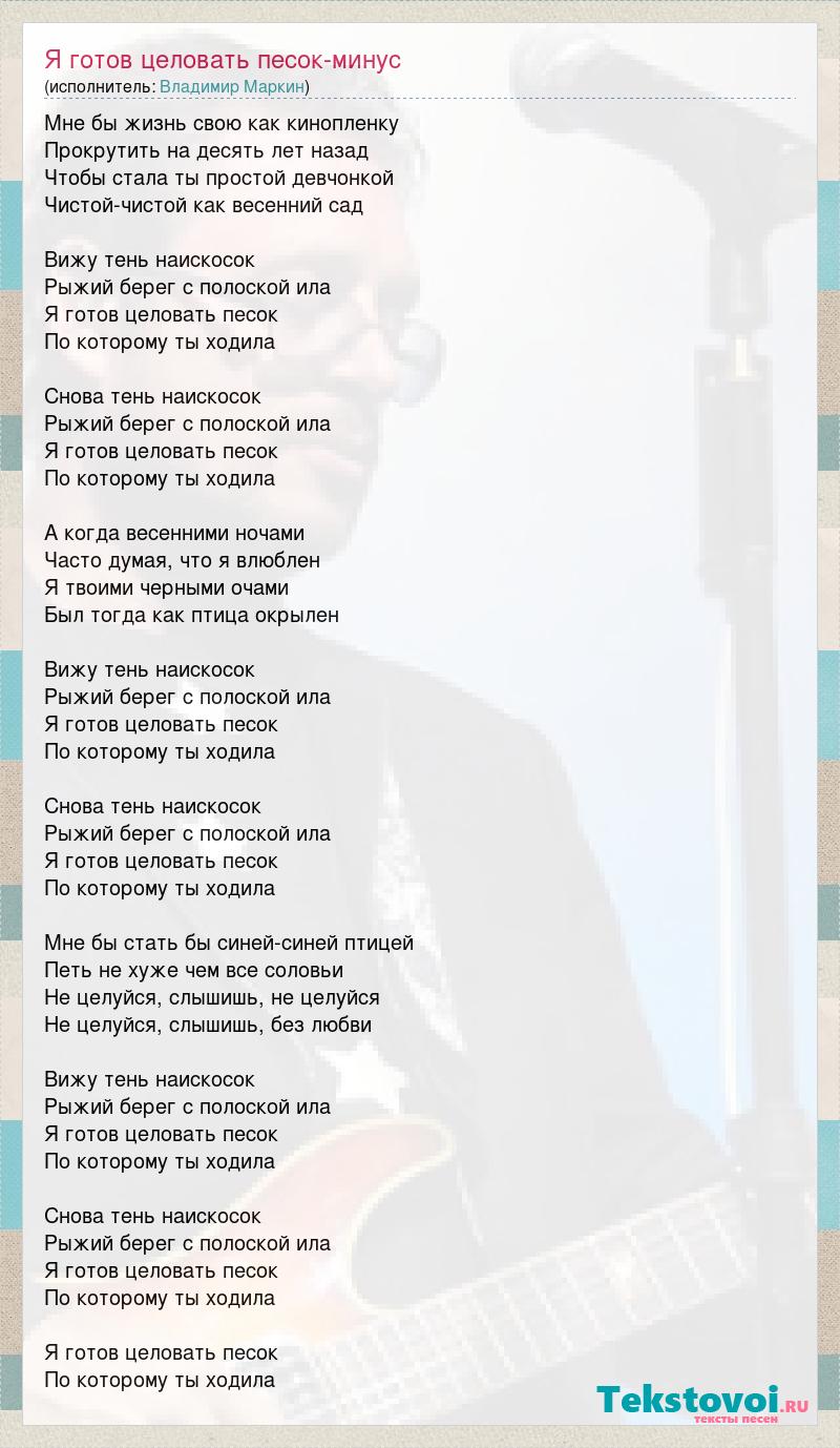 Мне бы жизнь свою как кинопленку Прокрутить на десять лет назад Чтобы стала ты простой девчонкой Чистой-чистой как весенний сад Вижу тень наискосок Рыжий берег с полоской ила Я готов целовать песок По которому ты ходила Снова тень наискосок Рыжий берег с полоской ила Я готов целовать песок По которому ты ходила А когда весенними ночами Часто думая, что я влюблен Я твоими черными очами Был тогда как птица окрылен Вижу тень наискосок Рыжий берег с полоской ила Я готов целовать песок По которому ты ходила Снова тень наискосок Рыжий берег с полоской ила Я готов целовать песок По которому ты ходила Мне бы стать бы синей-синей птицей Петь не хуже чем все соловьи Не целуйся, слышишь, не целуйся Не целуйся, слышишь, без любви Вижу тень наискосок Рыжий берег с полоской ила Я готов целовать песок По которому ты ходила Снова тень наискосок Рыжий берег с полоской ила Я готов целовать песок По которому ты ходила Я готов целовать песок По которому ты ходила