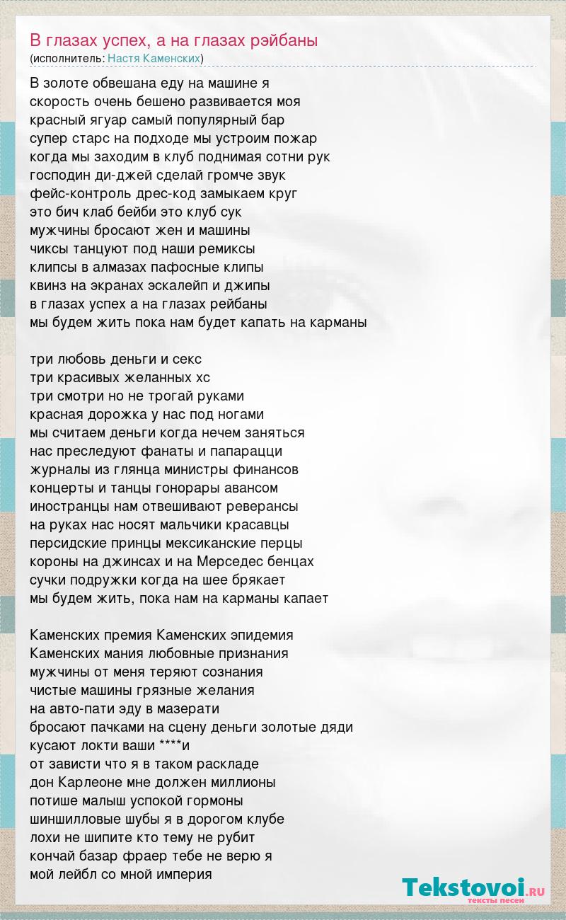 В золоте обвешана еду на машине я скорость очень бешено развивается моя красный ягуар самый популярный бар супер старс на подходе мы устроим пожар когда мы заходим в клуб поднимая сотни рук господин ди-джей сделай громче звук фейс-контроль дрес-код замыкаем круг это бич клаб бейби это клуб сук мужчины бросают жен и машины чиксы танцуют под наши ремиксы клипсы в алмазах пафосные клипы квинз на экранах эскалейп и джипы в глазах успех а на глазах рейбаны мы будем жить пока нам будет капать на карманы три любовь деньги и секс три красивых желанных хс три смотри но не трогай руками красная дорожка у нас под ногами мы считаем деньги когда нечем заняться нас преследуют фанаты и папарацци журналы из глянца министры финансов концерты и танцы гонорары авансом иностранцы нам отвешивают реверансы на руках нас носят мальчики красавцы персидские принцы мексиканские перцы короны на джинсах и на Мерседес бенцах сучки подружки когда на шее брякает мы будем жить, пока нам на карманы капает Каменских премия Каменских эпидемия Каменских мания любовные признания мужчины от меня теряют сознания чистые машины грязные желания на авто-пати эду в мазерати бросают пачками на сцену деньги золотые дяди кусают локти ваши ****и от зависти что я в таком раскладе дон Карлеоне мне должен миллионы потише малыш успокой гормоны шиншилловые шубы я в дорогом клубе лохи не шипите кто тему не рубит кончай базар фраер тебе не верю я мой лейбл со мной империя