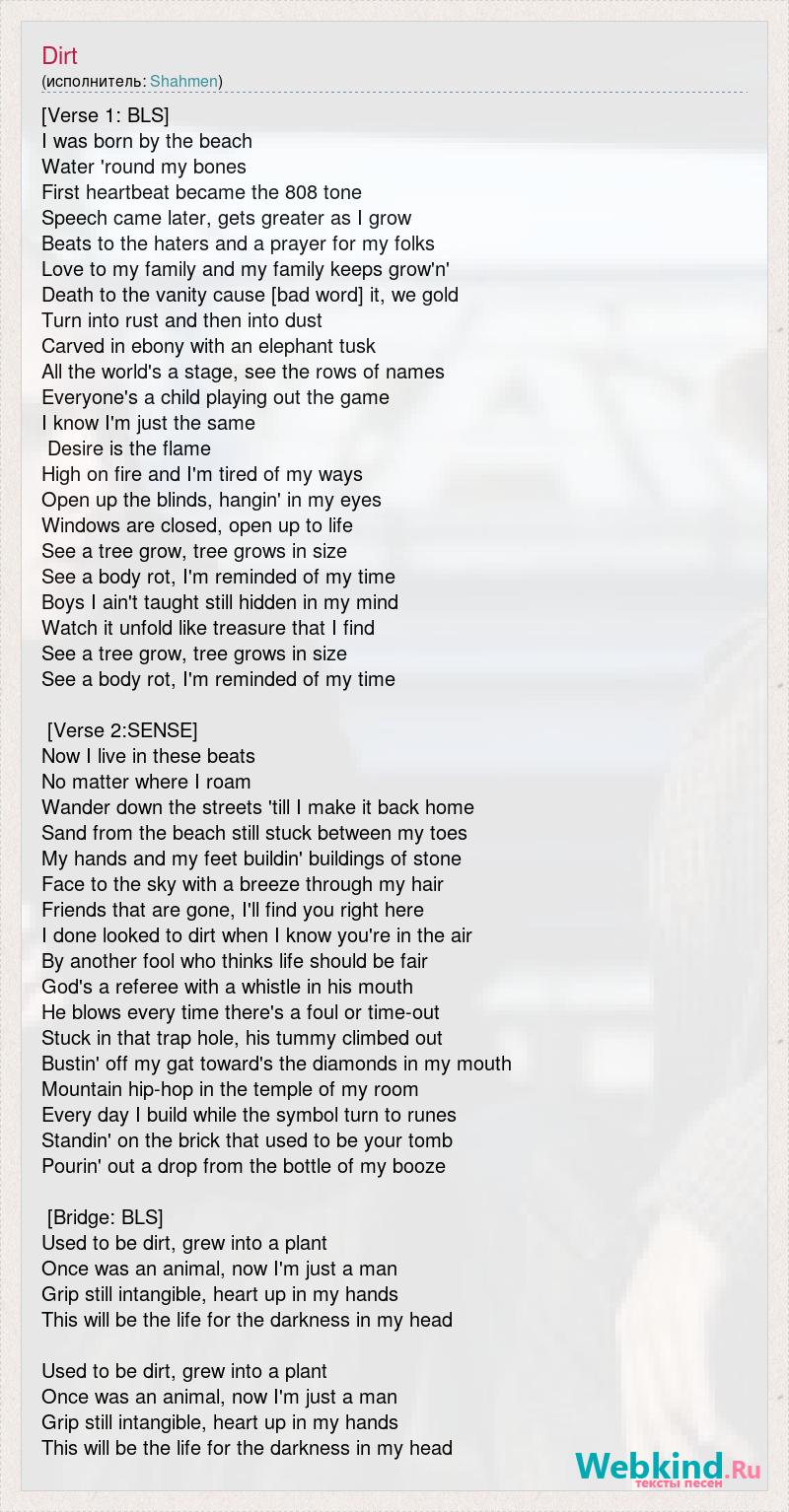 [Verse 1: BLS] I was born by the beach Water 'round my bones First heartbeat became the 808 tone Speech came later, gets greater as I grow Beats to the haters and a prayer for my folks Love to my family and my family keeps grow'n' Death to the vanity cause [bad word] it, we gold Turn into rust and then into dust Carved in ebony with an elephant tusk All the world's a stage, see the rows of names Everyone's a child playing out the game I know I'm just the same Desire is the flame High on fire and I'm tired of my ways Open up the blinds, hangin' in my eyes Windows are closed, open up to life See a tree grow, tree grows in size See a body rot, I'm reminded of my time Boys I ain't taught still hidden in my mind Watch it unfold like treasure that I find See a tree grow, tree grows in size See a body rot, I'm reminded of my time [Verse 2:SENSE] Now I live in these beats No matter where I roam Wander down the streets 'till I make it back home Sand from the beach still stuck between my toes My hands and my feet buildin' buildings of stone Face to the sky with a breeze through my hair Friends that are gone, I'll find you right here I done looked to dirt when I know you're in the air By another fool who thinks life should be fair God's a referee with a whistle in his mouth He blows every time there's a foul or time-out Stuck in that trap hole, his tummy climbed out Bustin' off my gat toward's the diamonds in my mouth Mountain hip-hop in the temple of my room Every day I build while the symbol turn to runes Standin' on the brick that used to be your tomb Pourin' out a drop from the bottle of my booze [Bridge: BLS] Used to be dirt, grew into a plant Once was an animal, now I'm just a man Grip still intangible, heart up in my hands This will be the life for the darkness in my head Used to be dirt, grew into a plant Once was an animal, now I'm just a man Grip still intangible, heart up in my hands This will be the life for the darkness in my head