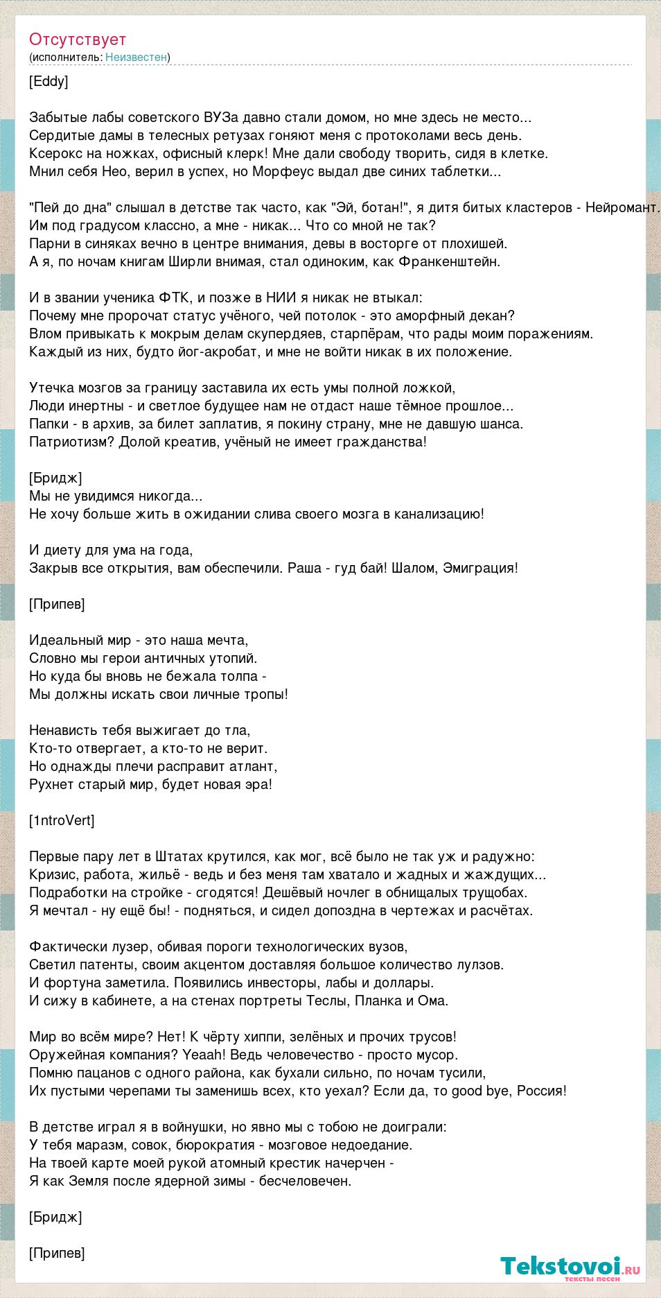 [Eddy] Забытые лабы советского ВУЗа давно стали домом, но мне здесь не место... Сердитые дамы в телесных ретузах гоняют меня с протоколами весь день. Ксерокс на ножках, офисный клерк! Мне дали свободу творить, сидя в клетке. Мнил себя Нео, верил в успех, но Морфеус выдал две синих таблетки... "Пей до дна" слышал в детстве так часто, как "Эй, ботан!", я дитя битых кластеров - Нейромант. Им под градусом классно, а мне - никак... Что со мной не так? Парни в синяках вечно в центре внимания, девы в восторге от плохишей. А я, по ночам книгам Ширли внимая, стал одиноким, как Франкенштейн. И в звании ученика ФТК, и позже в НИИ я никак не втыкал: Почему мне пророчат статус учёного, чей потолок - это аморфный декан? Влом привыкать к мокрым делам скупердяев, старпёрам, что рады моим поражениям. Каждый из них, будто йог-акробат, и мне не войти никак в их положение. Утечка мозгов за границу заставила их есть умы полной ложкой, Люди инертны - и светлое будущее нам не отдаст наше тёмное прошлое... Папки - в архив, за билет заплатив, я покину страну, мне не давшую шанса. Патриотизм? Долой креатив, учёный не имеет гражданства! [Бридж] Мы не увидимся никогда... Не хочу больше жить в ожидании слива своего мозга в канализацию! И диету для ума на года, Закрыв все открытия, вам обеспечили. Раша - гуд бай! Шалом, Эмиграция! [Припев] Идеальный мир - это наша мечта, Словно мы герои античных утопий. Но куда бы вновь не бежала толпа - Мы должны искать свои личные тропы! Ненависть тебя выжигает до тла, Кто-то отвергает, а кто-то не верит. Но однажды плечи расправит атлант, Рухнет старый мир, будет новая эра! [1ntroVert] Первые пару лет в Штатах крутился, как мог, всё было не так уж и радужно: Кризис, работа, жильё - ведь и без меня там хватало и жадных и жаждущих... Подработки на стройке - сгодятся! Дешёвый ночлег в обнищалых трущобах. Я мечтал - ну ещё бы! - подняться, и сидел допоздна в чертежах и расчётах. Фактически лузер, обивая пороги технологических вузов, Светил патенты, своим акцентом доставляя большое количество лулзов. И фортуна заметила. Появились инвесторы, лабы и доллары. И сижу в кабинете, а на стенах портреты Теслы, Планка и Ома. Мир во всём мире? Нет! К чёрту хиппи, зелёных и прочих трусов! Оружейная компания? Yeaah! Ведь человечество - просто мусор. Помню пацанов с одного района, как бухали сильно, по ночам тусили, Их пустыми черепами ты заменишь всех, кто уехал? Если да, то good bye, Россия! В детстве играл я в войнушки, но явно мы с тобою не доиграли: У тебя маразм, совок, бюрократия - мозговое недоедание. На твоей карте моей рукой атомный крестик начерчен - Я как Земля после ядерной зимы - бесчеловечен. [Бридж] [Припев]