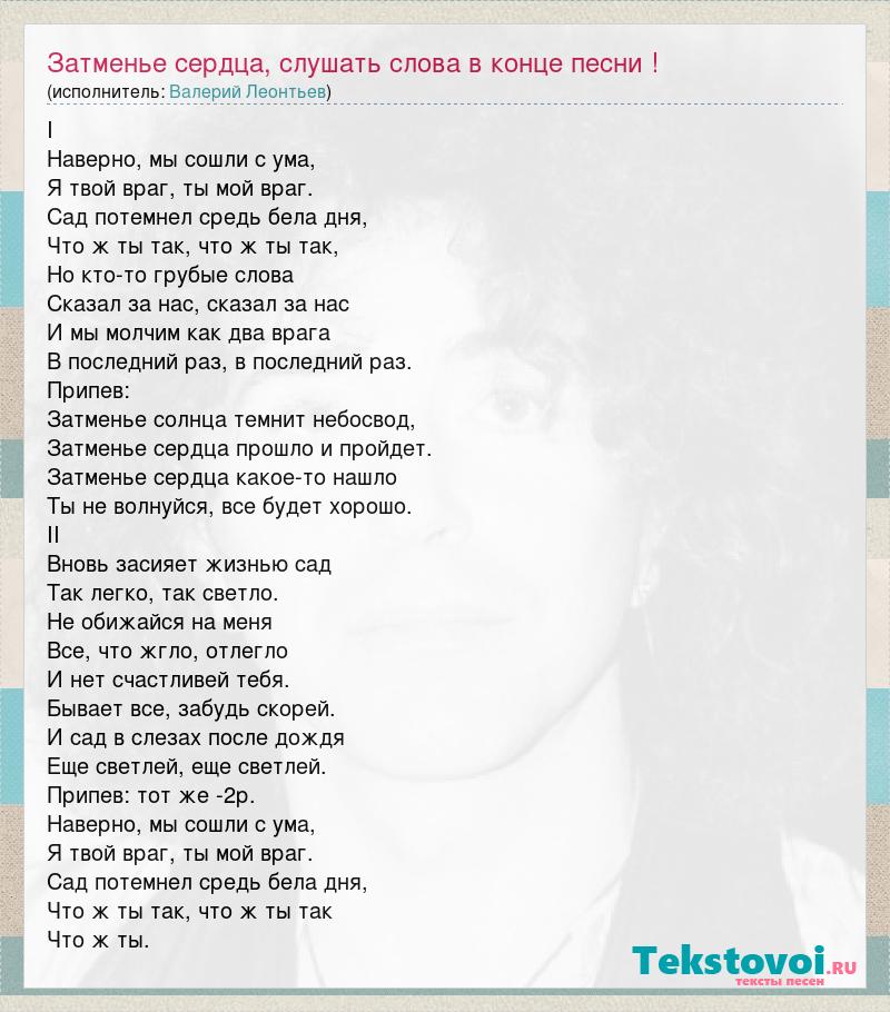 I Наверно, мы сошли с ума, Я твой враг, ты мой враг. Сад потемнел средь бела дня, Что ж ты так, что ж ты так, Но кто-то грубые слова Сказал за нас, сказал за нас И мы молчим как два врага В последний раз, в последний раз. Припев: Затменье солнца темнит небосвод, Затменье сердца прошло и пройдет. Затменье сердца какое-то нашло Ты не волнуйся, все будет хорошо. II Вновь засияет жизнью сад Так легко, так светло. Не обижайся на меня Все, что жгло, отлегло И нет счастливей тебя. Бывает все, забудь скорей. И сад в слезах после дождя Еще светлей, еще светлей. Припев: тот же -2р. Наверно, мы сошли с ума, Я твой враг, ты мой враг. Сад потемнел средь бела дня, Что ж ты так, что ж ты так Что ж ты.