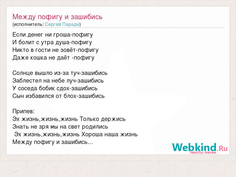 Если денег ни гроша-пофигу И болит с утра душа-пофигу Никто в гости не зовёт-пофигу Даже кошка не даёт -пофигу Солнце вышло из-за туч-зашибись Заблестел на небе луч-зашибись У соседа бобик сдох-зашибись Сын избавился от блох-зашибись Припев: Эх жизнь,жизнь,жизнь Только держись Знать не зря мы на свет родились Эх жизнь,жизнь,жизнь Хороша наша жизнь Между пофигу и зашибись...