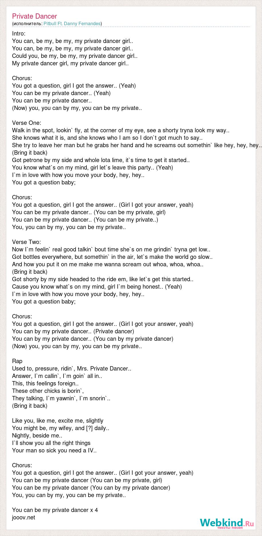 Intro: You can, be my, be my, my private dancer girl.. You can, be my, be my, my private dancer girl.. Could you, be my, be my, my private dancer girl.. My private dancer girl, my private dancer girl.. Chorus: You got a question, girl I got the answer.. (Yeah) You can be my private dancer.. (Yeah) You can be my private dancer.. (Now) you, you can by my, you can be my private.. Verse One: Walk in the spot, lookin` fly, at the corner of my eye, see a shorty tryna look my way.. She knows what it is, and she knows who I am so I don`t got much to say.. She try to leave her man but he grabs her hand and he screams out somethin` like hey, hey, hey.. (Bring it back) Got petrone by my side and whole lota lime, it`s time to get it started.. You know what`s on my mind, girl let`s leave this party.. (Yeah) I`m in love with how you move your body, hey, hey.. You got a question baby; Chorus: You got a question, girl I got the answer.. (Girl I got your answer, yeah) You can be my private dancer.. (You can be my private, girl) You can be my private dancer.. (You can be my private..) You, you can by my, you can be my private.. Verse Two: Now I`m feelin` real good talkin` bout time she`s on me grindin` tryna get low.. Got bottles everywhere, but somethin` in the air, let`s make the world go slow.. And how you put it on me make me wanna scream out whoa, whoa, whoa.. (Bring it back) Got shorty by my side headed to the ride em, like let`s get this started.. Cause you know what`s on my mind, girl I`m being honest.. (Yeah) I`m in love with how you move your body, hey, hey.. You got a question baby; Chorus: You got a question, girl I got the answer.. (Girl I got your answer, yeah) You can by my private dancer.. (Private dancer) You can by my private dancer.. (You can by my private dancer) (Now) you, you can by my, you can be my private.. Rap Used to, pressure, ridin`, Mrs. Private Dancer.. Answer, I`m callin`, I`m goin` all in.. This, this feelings foreign.. These other chicks is borin`, They talking, I`m yawnin`, I`m snorin`.. (Bring it back) Like you, like me, excite me, slightly You might be, my wifey, and [?] daily.. Nightly, beside me.. I`ll show you all the right things Your man so sick you need a IV.. Chorus: You got a question, girl I got the answer.. (Girl I got your answer, yeah) You can be my private dancer (You can be my private, girl) You can be my private dancer (You can by my private dancer) You, you can by my, you can be my private.. You can be my private dancer x 4 jooov.net