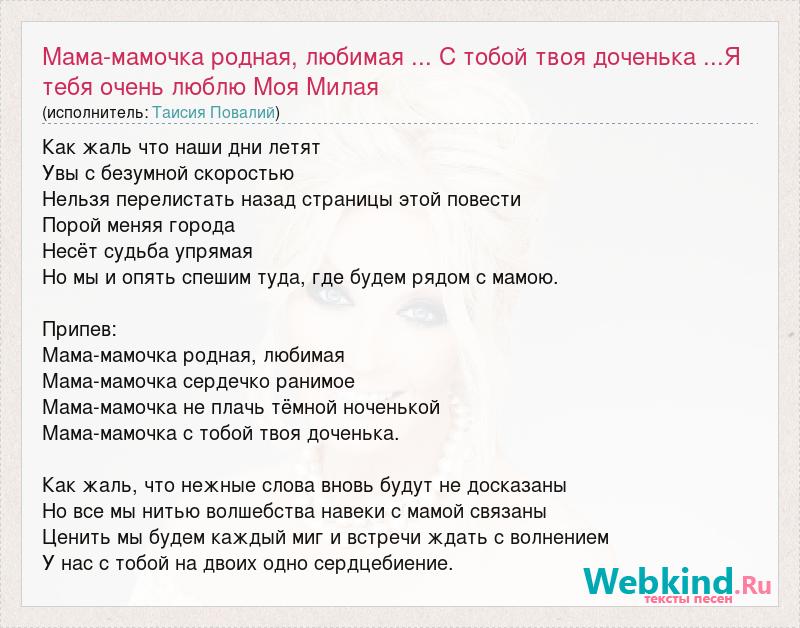 Главная→Исполнители→Таисия Повалий→Мама-мамочка родная, любимая ... С тобой твоя доченька ...Я тебя очень