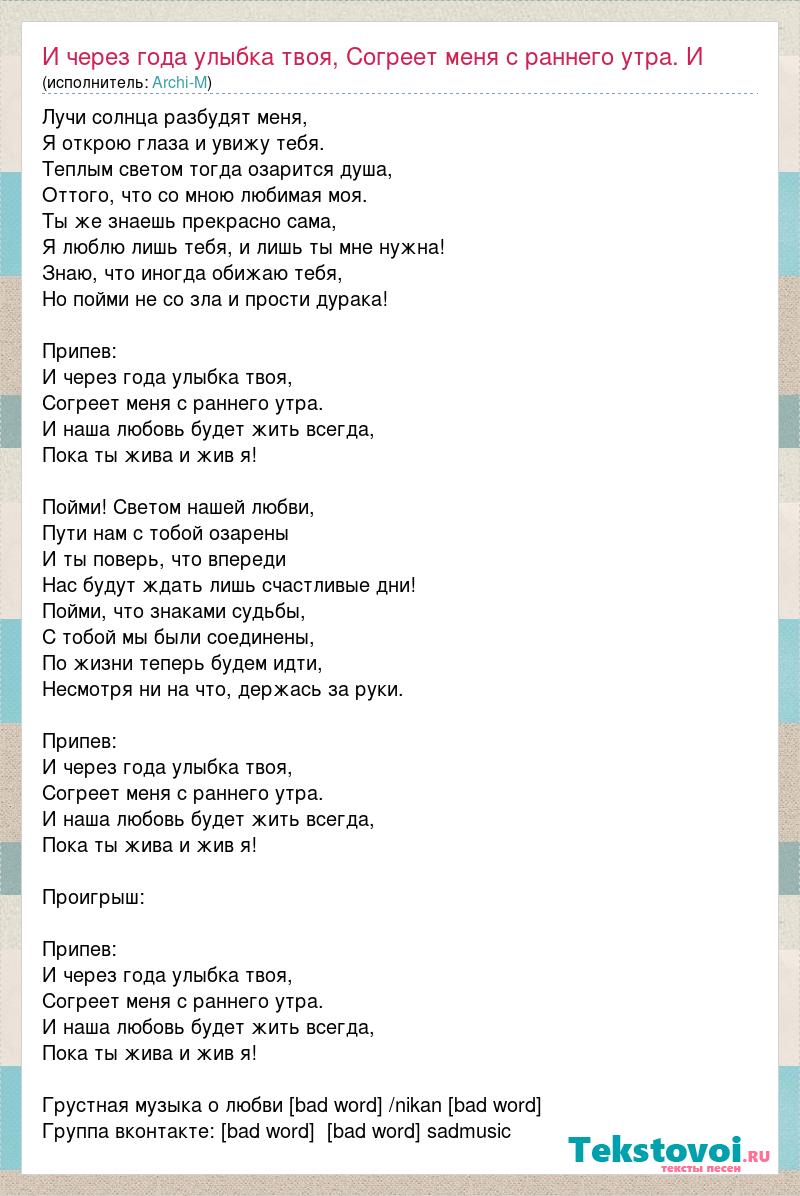 Лучи солнца разбудят меня, Я открою глаза и увижу тебя. Теплым светом тогда озарится душа, Оттого, что со мною любимая моя. Ты же знаешь прекрасно сама, Я люблю лишь тебя, и лишь ты мне нужна! Знаю, что иногда обижаю тебя, Но пойми не со зла и прости дурака! Припев: И через года улыбка твоя, Согреет меня с раннего утра. И наша любовь будет жить всегда, Пока ты жива и жив я! Пойми! Светом нашей любви, Пути нам с тобой озарены И ты поверь, что впереди Нас будут ждать лишь счастливые дни! Пойми, что знаками судьбы, С тобой мы были соединены, По жизни теперь будем идти, Несмотря ни на что, держась за руки. Припев: И через года улыбка твоя, Согреет меня с раннего утра. И наша любовь будет жить всегда, Пока ты жива и жив я! Проигрыш: Припев: И через года улыбка твоя, Согреет меня с раннего утра. И наша любовь будет жить всегда, Пока ты жива и жив я! Грустная музыка о любви [bad word] /nikan [bad word] Группа вконтакте: [bad word] [bad word] sadmusic