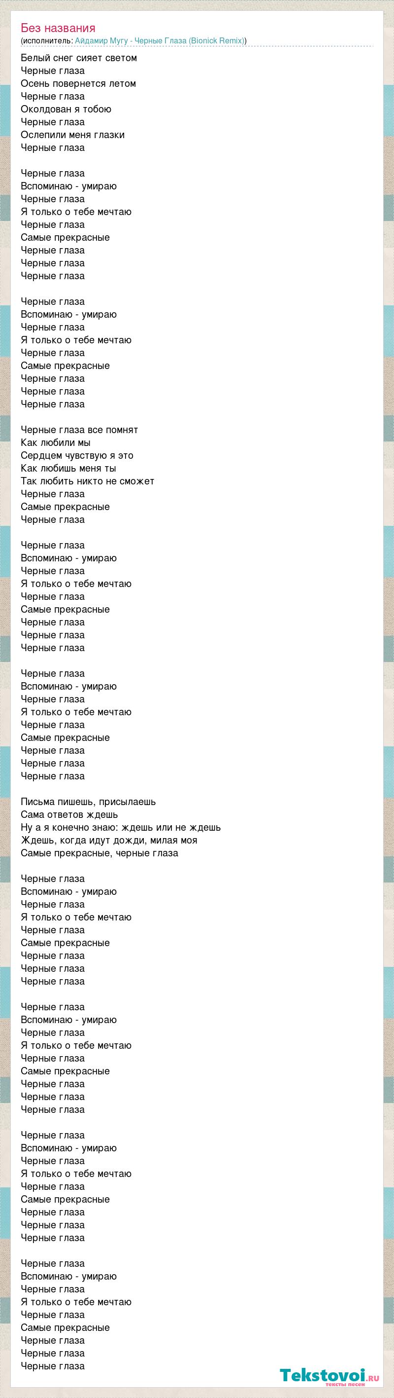 Белый снег сияет светом Черные глаза Осень повернется летом Черные глаза Околдован я тобою Черные глаза Ослепили меня глазки Черные глаза Черные глаза Вспоминаю - умираю Черные глаза Я только о тебе мечтаю Черные глаза Самые прекрасные Черные глаза Черные глаза Черные глаза Черные глаза Вспоминаю - умираю Черные глаза Я только о тебе мечтаю Черные глаза Самые прекрасные Черные глаза Черные глаза Черные глаза Черные глаза все помнят Как любили мы Сердцем чувствую я это Как любишь меня ты Так любить никто не сможет Черные глаза Самые прекрасные Черные глаза Черные глаза Вспоминаю - умираю Черные глаза Я только о тебе мечтаю Черные глаза Самые прекрасные Черные глаза Черные глаза Черные глаза Черные глаза Вспоминаю - умираю Черные глаза Я только о тебе мечтаю Черные глаза Самые прекрасные Черные глаза Черные глаза Черные глаза Письма пишешь, присылаешь Сама ответов ждешь Ну а я конечно знаю: ждешь или не ждешь Ждешь, когда идут дожди, милая моя Самые прекрасные, черные глаза Черные глаза Вспоминаю - умираю Черные глаза Я только о тебе мечтаю Черные глаза Самые прекрасные Черные глаза Черные глаза Черные глаза Черные глаза Вспоминаю - умираю Черные глаза Я только о тебе мечтаю Черные глаза Самые прекрасные Черные глаза Черные глаза Черные глаза Черные глаза Вспоминаю - умираю Черные глаза Я только о тебе мечтаю Черные глаза Самые прекрасные Черные глаза Черные глаза Черные глаза Черные глаза Вспоминаю - умираю Черные глаза Я только о тебе мечтаю Черные глаза Самые прекрасные Черные глаза Черные глаза Черные глаза