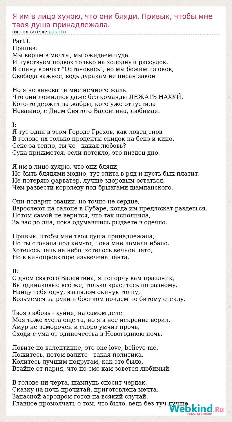 Part I. Припев: Мы верим в мечты, мы ожидаем чуда, И чувствуем подвох только на холодный рассудок. В спину кричат "Остановись", но мы бежим из оков, Свобода важнее, ведь дуракам не писан закон Но я не виноват и мне немного жаль Что они ложились даже без команды ЛЕЖАТЬ НАХУЙ. Кого-то держит за жабры, кого уже отпустила Неважно, с Днем Святого Валентина, любимая. I: Я тут один в этом Городе Грехов, как ловец снов В голове их только проценты скидок на бенз и кино. Секс за тепло, ты че - какая любовь? Сука прижмется, если потекло, это пиздец дно. Я им в лицо хуярю, что они бляди, Но быть блядями модно, тут элита в ряд и пусть бык платит. Не потеряю фарватер, лучше здоровым остаться, Чем развести королеву под брызгами шампанского. Они подарят овации, но точно не сердце, Взрослеют на салоне в Субаре, когда им предложат раздеться. Потом самой не верится, что так исполняла, За вас до дна, пока одумавшись рыдаете в одеяло. Привык, чтобы мне твоя душа принадлежала, Но ты стонала под кем-то, пока мне ломали ибало. Хотелось лечь на небо, хотелось вечное лето, Но в кинопроекторе изувечена лента. II: С днем святого Валентина, я испорчу вам праздник, Вы одинаковые всё же, только краситесь по разному. Найду тебя одну, взглядом окинув толпу, Возьмемся за руки и босиком пойдем по битому стеклу. Твоя любовь - хуйня, на самом деле Моя тоже хуета еще та, но я в нее искренне верил. Амур не заморочен и скоро умчит прочь, Сходи с ума от одиночества в Новогоднюю ночь. Ловите по валентинке, это one love, believe me, Ложитесь, потом валите - такая политика. Колитесь лучшим подругам, как это было, Втайне от парня, что по смс-кам зовется любимый. В голове ни черта, шампунь сносит чердак, Сказку на ночь прочитай, приготовлена мечта. Запасной аэродром готов на всякий случай, Главное промолчать о том, что было, ведь без туч лучше.