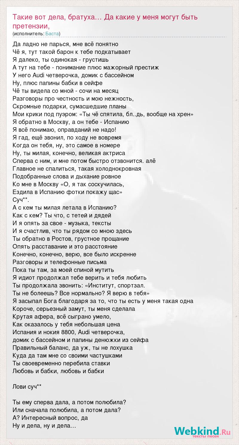 Да ладно не парься, мне всё понятно Чё я, тут такой барон к тебе подкатывает Я далеко, ты одинокая - грустишь А тут на тебе - понимание плюс мажорный престиж У него Audi четверочка, домик с бассейном Ну, плюс папины бабки в сейфе Чё ты видела со мной - сочи на месяц Разговоры про честность и мою нежность, Скромные подарки, сумасшедшие планы Мои крики под пуэром: «Ты чё спятила, бл..дь, вообще на хрен» Я обратно в Москву, а он тебе - Испанию Я всё понимаю, оправданий не надо! Я гад, ещё звонил, по ходу не вовремя Когда он тебя, ну, это самое в номере Ну, ты милая, конечно, великая актриса Сперва с ним, и мне потом быстро отзвонится. алё Главное не спалиться, такая холоднокровная Подобранные слова и дыхание ровное Ко мне в Москву «О, я так соскучилась, Ездила в Испанию фотки покажу щас» Суч**. А с кем ты милая летала в Испанию? Как с кем? Ты что, с тетей и дядей И я опять за свое - музыка, тексты И я счастлив, что ты рядом со мною здесь Ты обратно в Ростов, грустное прощание Опять расставание и это расстояние Конечно, конечно, верю, все было искренне Разговоры и телефонные письма Пока ты там, за моей спиной мутить Я идиот продолжал тебе верить и тебя любить Ты продолжала звонить: «Институт, спортзал. Ты не болеешь? Все нормально? Я верю в тебя» Я засыпал Бога благодаря за то, что ты есть у меня такая одна Короче, серьезный замут, ты меня сделала Крутая афера, всё сыграно умело, Как оказалось у тебя небольшая цена Испания и нокия 8800, Audi четверочка, домик с бассейном и папины денюжки из сейфа Правильный баланс, да уж, ты не лохушка Куда да там мне со своими частушками Ты своевременно перебила ставки Любовь и бабки, любовь и бабки Лови суч** Ты ему сперва дала, а потом полюбила? Или сначала полюбила, а потом дала? А? Интересный вопрос, да Ну и дела, ну и дела…