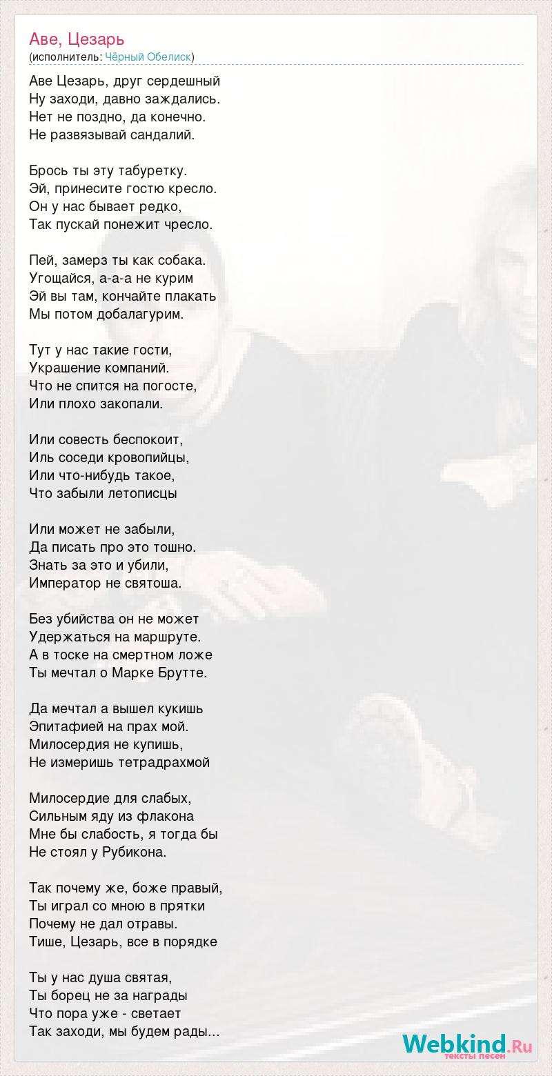 Аве Цезарь, друг сердешный Ну заходи, давно заждались. Нет не поздно, да конечно. Не развязывай сандалий. Брось ты эту табуретку. Эй, принесите гостю кресло. Он у нас бывает редко, Так пускай понежит чресло. Пей, замерз ты как собака. Угощайся, а-a-a не курим Эй вы там, кончайте плакать Мы потом добалагурим. Тут у нас такие гости, Украшение компаний. Что не спится на погосте, Или плохо закопали. Или совесть беспокоит, Иль соседи кровопийцы, Или что-нибудь такое, Что забыли летописцы Или может не забыли, Да писать про это тошно. Знать за это и убили, Император не святоша. Без убийства он не может Удержаться на маршруте. А в тоске на смертном ложе Ты мечтал о Марке Брутте. Да мечтал а вышел кукишь Эпитафией на прах мой. Милосердия не купишь, Не измеришь тетрадрахмой Милосердие для слабых, Сильным яду из флакона Мне бы слабость, я тогда бы Не стоял у Рубикона. Так почему же, боже правый, Ты играл со мною в прятки Почему не дал отравы. Тише, Цезарь, все в порядке Ты у нас душа святая, Ты борец не за награды Что пора уже - светает Так заходи, мы будем рады...