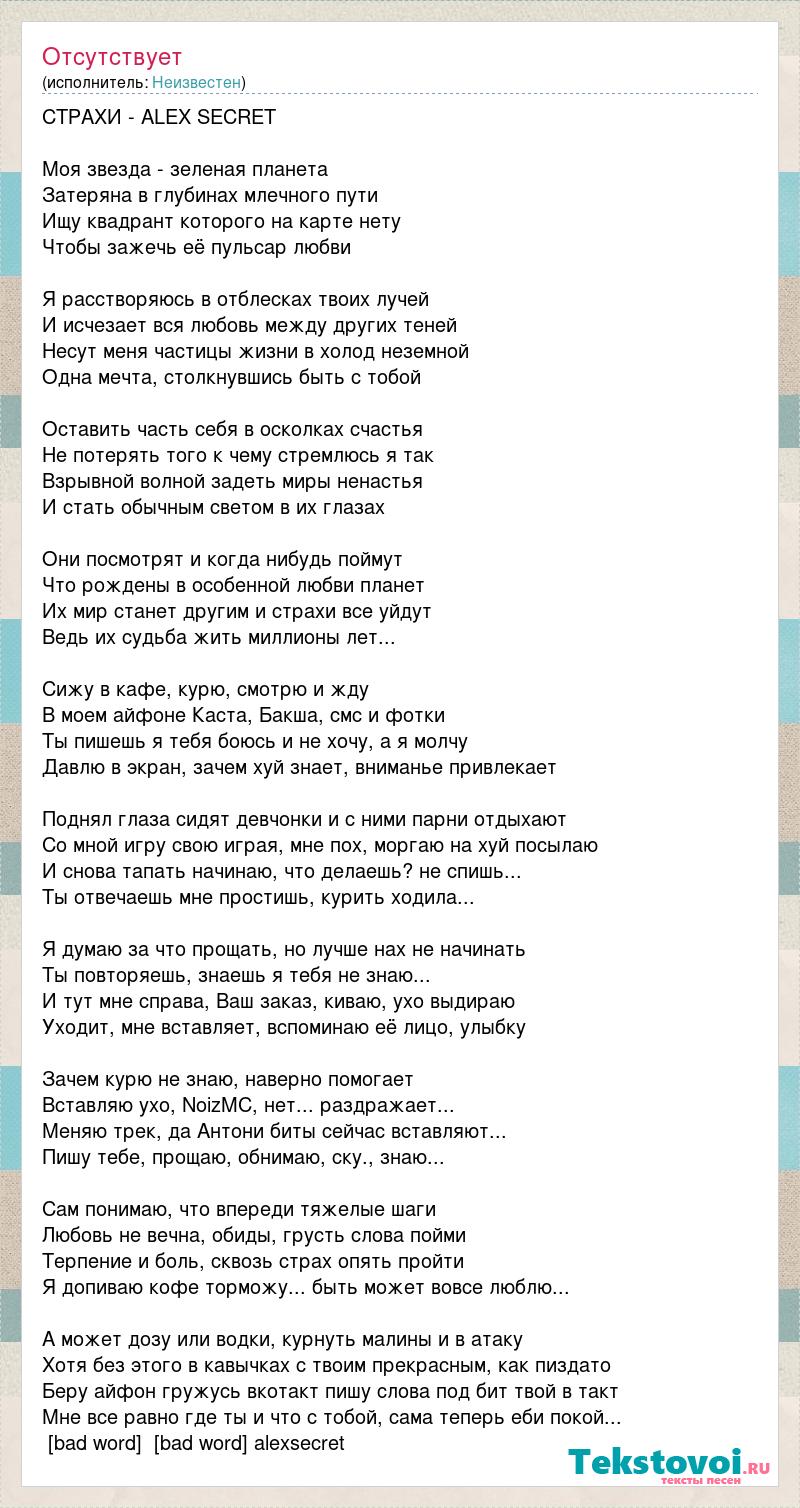СТРАХИ - ALEX SECRET Моя звезда - зеленая планета Затеряна в глубинах млечного пути Ищу квадрант которого на карте нету Чтобы зажечь её пульсар любви Я расстворяюсь в отблесках твоих лучей И исчезает вся любовь между других теней Несут меня частицы жизни в холод неземной Одна мечта, столкнувшись быть с тобой Оставить часть себя в осколках счастья Не потерять того к чему стремлюсь я так Взрывной волной задеть миры ненастья И стать обычным светом в их глазах Они посмотрят и когда нибудь поймут Что рождены в особенной любви планет Их мир станет другим и страхи все уйдут Ведь их судьба жить миллионы лет... Сижу в кафе, курю, смотрю и жду В моем айфоне Каста, Бакша, смс и фотки Ты пишешь я тебя боюсь и не хочу, а я молчу Давлю в экран, зачем хуй знает, вниманье привлекает Поднял глаза сидят девчонки и с ними парни отдыхают Со мной игру свою играя, мне пох, моргаю на хуй посылаю И снова тапать начинаю, что делаешь? не спишь... Ты отвечаешь мне простишь, курить ходила... Я думаю за что прощать, но лучше нах не начинать Ты повторяешь, знаешь я тебя не знаю... И тут мне справа, Ваш заказ, киваю, ухо выдираю Уходит, мне вставляет, вспоминаю её лицо, улыбку Зачем курю не знаю, наверно помогает Вставляю ухо, NoizMC, нет... раздражает... Меняю трек, да Антони биты сейчас вставляют... Пишу тебе, прощаю, обнимаю, ску., знаю... Сам понимаю, что впереди тяжелые шаги Любовь не вечна, обиды, грусть слова пойми Терпение и боль, сквозь страх опять пройти Я допиваю кофе торможу... быть может вовсе люблю... А может дозу или водки, курнуть малины и в атаку Хотя без этого в кавычках с твоим прекрасным, как пиздато Беру айфон гружусь вкотакт пишу слова под бит твой в такт Мне все равно где ты и что с тобой, сама теперь еби покой... [bad word] [bad word] alexsecret