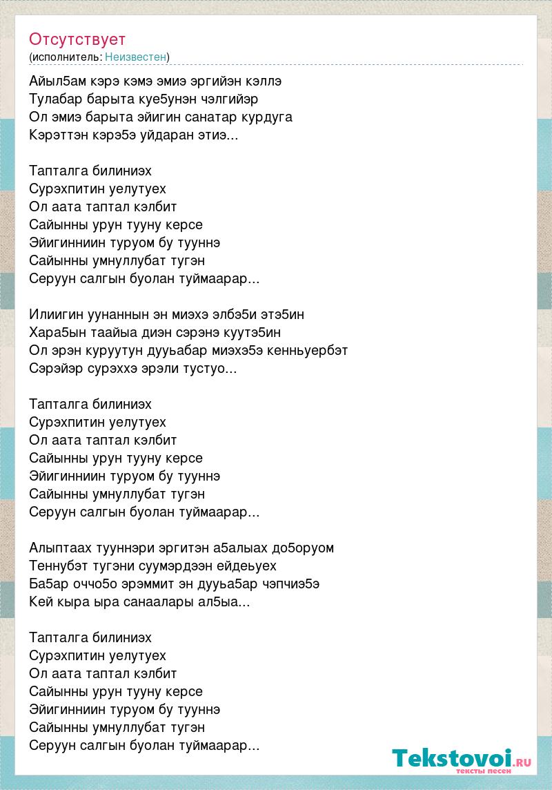 Айыл5ам кэрэ кэмэ эмиэ эргийэн кэллэ Тулабар барыта куе5унэн чэлгийэр Ол эмиэ барыта эйигин санатар курдуга Кэрэттэн кэрэ5э уйдаран этиэ... Тапталга билиниэх Сурэхпитин уелутуех Ол аата таптал кэлбит Сайынны урун тууну керсе Эйигинниин туруом бу тууннэ Сайынны умнуллубат тугэн Серуун салгын буолан туймаарар... Илиигин уунаннын эн миэхэ элбэ5и этэ5ин Хара5ын таайыа диэн сэрэнэ куутэ5ин Ол эрэн куруутун дууьабар миэхэ5э кенньуербэт Сэрэйэр сурэххэ эрэли тустуо... Тапталга билиниэх Сурэхпитин уелутуех Ол аата таптал кэлбит Сайынны урун тууну керсе Эйигинниин туруом бу тууннэ Сайынны умнуллубат тугэн Серуун салгын буолан туймаарар... Алыптаах тууннэри эргитэн а5алыах до5оруом Теннубэт тугэни суумэрдээн ейдеьуех Ба5ар оччо5о эрэммит эн дууьа5ар чэпчиэ5э Кей кыра ыра санаалары ал5ыа... Тапталга билиниэх Сурэхпитин уелутуех Ол аата таптал кэлбит Сайынны урун тууну керсе Эйигинниин туруом бу тууннэ Сайынны умнуллубат тугэн Серуун салгын буолан туймаарар...