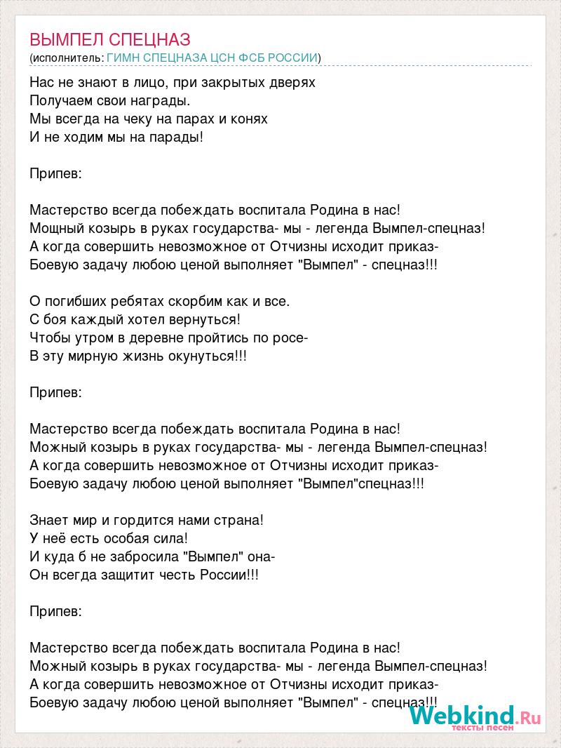 Нас не знают в лицо, при закрытых дверях Получаем свои награды. Мы всегда на чеку на парах и конях И не ходим мы на парады! Припев: Мастерство всегда побеждать воспитала Родина в нас! Мощный козырь в руках государства- мы - легенда Вымпел-спецназ! А когда совершить невозможное от Отчизны исходит приказ- Боевую задачу любою ценой выполняет "Вымпел" - спецназ!!! О погибших ребятах скорбим как и все. С боя каждый хотел вернуться! Чтобы утром в деревне пройтись по росе- В эту мирную жизнь окунуться!!! Припев: Мастерство всегда побеждать воспитала Родина в нас! Можный козырь в руках государства- мы - легенда Вымпел-спецназ! А когда совершить невозможное от Отчизны исходит приказ- Боевую задачу любою ценой выполняет "Вымпел"спецназ!!! Знает мир и гордится нами страна! У неё есть особая сила! И куда б не забросила "Вымпел" она- Он всегда защитит честь России!!! Припев: Мастерство всегда побеждать воспитала Родина в нас! Можный козырь в руках государства- мы - легенда Вымпел-спецназ! А когда совершить невозможное от Отчизны исходит приказ- Боевую задачу любою ценой выполняет "Вымпел" - спецназ!!!