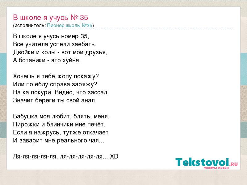 В школе я учусь номер 35, Все учителя успели заебать. Двойки и колы - вот мои друзья, А ботаники - это хуйня. Хочешь я тебе жопу покажу? Или по еблу справа заряжу? На ка покури. Видно, что зассал. Значит береги ты свой анал. Бабушка моя любит, блять, меня. Пирожки и блинчики мне печёт. Если я нажрусь, тутже откачает И заварит мне реального чая... Ля-ля-ля-ля-ля, ля-ля-ля-ля-ля... XD