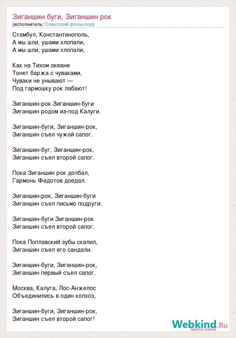 Стамбул, Константинополь, А мы шли, ушами хлопали, А мы шли, ушами хлопали, Как на Тихом океане Тонет баржа с чуваками, Чуваки не унывают — Под гармошку рок лабают! Зиганшин-рок Зиганшин-буги Зиганшин родом из-под Калуги. Зиганшин-буги, Зиганшин-рок, Зиганшин съел чужой сапог. Зиганшин-буг, Зиганшин-рок, Зиганшин съел второй сапог. Пока Зиганшин рок долбал, Гармонь Федотов доедал. Зиганшин-рок, Зиганшин-буги Зиганшин съел письмо подруги. Зиганшин-буги Зиганшин-рок Зиганшин съел второй сапог. Пока Поплавский зубы скалил, Зиганшин съел его сандали. Зиганшин-буги, Зиганшин-рок, Зиганшин первый съел сапог. Москва, Калуга, Лос-Анжелос Объединились в один колхоз, Зиганшин-буги, Зиганшин-рок, Зиганшин съел второй сапог!