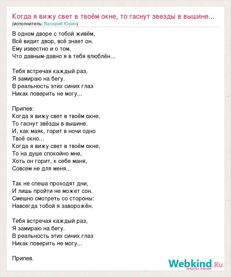 В одном дворе с тобой живём, Всё видит двор, всё знает он. Ему известно и о том, Что давным-давно я в тебя влюблён... Тебя встречая каждый раз, Я замираю на бегу. В реальность этих синих глаз Никак поверить не могу... Припев: Когда я вижу свет в твоём окне, То гаснут звёзды в вышине. И, как маяк, горит в ночи одно Твоё окно... Когда я вижу свет в твоём окне, То на душе спокойно мне, Хоть он горит, к себе маня, Совсем не для меня... Так не спеша проходят дни, И лишь пройти не может сон. Смешно смотреть со стороны: Навсегда тобой я заворожён. Тебя встречая каждый раз, Я замираю на бегу. В реальность этих синих глаз Никак поверить не могу... Припев.