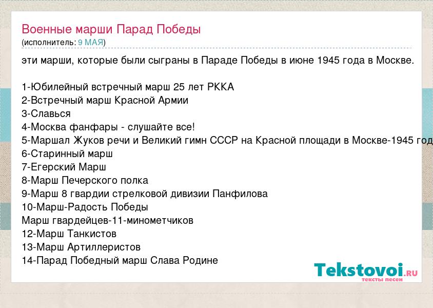 эти марши, которые были сыграны в Параде Победы в июне 1945 года в Москве. 1-Юбилейный встречный марш 25 лет РККА 2-Встречный марш Красной Армии 3-Славься 4-Москва фанфары - слушайте все! 5-Маршал Жуков речи и Великий гимн СССР на Красной площади в Москве-1945 год 6-Старинный марш 7-Егерский Марш 8-Марш Печерского полка 9-Марш 8 гвардии стрелковой дивизии Панфилова 10-Марш-Радость Победы Марш гвардейцев-11-минометчиков 12-Марш Танкистов 13-Марш Артиллеристов 14-Парад Победный марш Слава Родине