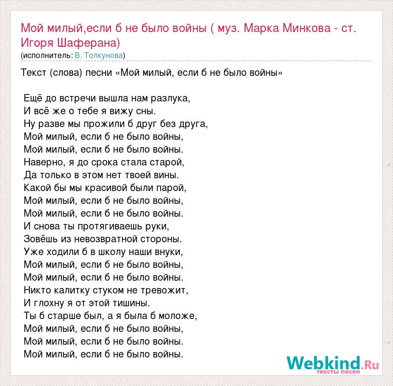 Текст (слова) песни «Мой милый, если б не было войны» Ещё до встречи вышла нам разлука, И всё же о тебе я вижу сны. Ну разве мы прожили б друг без друга, Мой милый, если б не было войны, Мой милый, если б не было войны. Наверно, я до срока стала старой, Да только в этом нет твоей вины. Какой бы мы красивой были парой, Мой милый, если б не было войны, Мой милый, если б не было войны. И снова ты протягиваешь руки, Зовёшь из невозвратной стороны. Уже ходили б в школу наши внуки, Мой милый, если б не было войны, Мой милый, если б не было войны. Никто калитку стуком не тревожит, И глохну я от этой тишины. Ты б старше был, а я была б моложе, Мой милый, если б не было войны, Мой милый, если б не было войны. Мой милый, если б не было войны.