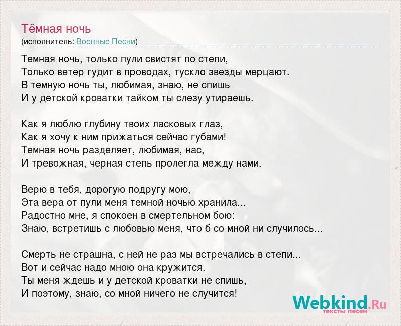 Темная ночь, только пули свистят по степи, Только ветер гудит в проводах, тускло звезды мерцают. В темную ночь ты, любимая, знаю, не спишь И у детской кроватки тайком ты слезу утираешь. Как я люблю глубину твоих ласковых глаз, Как я хочу к ним прижаться сейчас губами! Темная ночь разделяет, любимая, нас, И тревожная, черная степь пролегла между нами. Верю в тебя, дорогую подругу мою, Эта вера от пули меня темной ночью хранила... Радостно мне, я спокоен в смертельном бою: Знаю, встретишь с любовью меня, что б со мной ни случилось... Смерть не страшна, с ней не раз мы встречались в степи... Вот и сейчас надо мною она кружится. Ты меня ждешь и у детской кроватки не спишь, И поэтому, знаю, со мной ничего не случится!