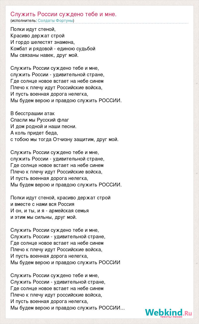 Полки идут стеной, Красиво держат строй И гордо шелестят знамена, Комбат и рядовой - единою судьбой Мы связаны навек, друг мой. Служить России суждено тебе и мне, служить России - удивительной стране, Где солнце новое встает на небе синем Плечо к плечу идут Российские войска, И пусть военная дорога нелегка, Мы будем верою и правдою служить РОССИИ. В бесстрашии атак Спасли мы Русский флаг И дом родной и наши песни. А коль придет беда, с тобою мы тогда Отчизну защитим, друг мой. Служить России суждено тебе и мне, служить России - удивительной стране, Где солнце новое встает на небе синем Плечо к плечу идут Российские войска, И пусть военная дорога нелегка, Мы будем верою и правдою служить РОССИИ. Полки идут стеной, красиво держат строй и вместе с нами вся Россия И он, и ты, и я - армейская семья и этим мы сильны, друг мой. Служить России суждено тебе и мне, Служить России - удивительной стране, Где солнце новое встает на небе синем Плечо к плечу идут Российские войска, И пусть военная дорога нелегка, Мы будем верою и правдою служить РОССИИ Служить России суждено тебе и мне, Служить России - удивительной стране, Где солнце новое встает на небе синем Плечо к плечу идут российские войска, И пусть военная дорога нелегка, Мы будем верою и правдою служить РОССИИ...