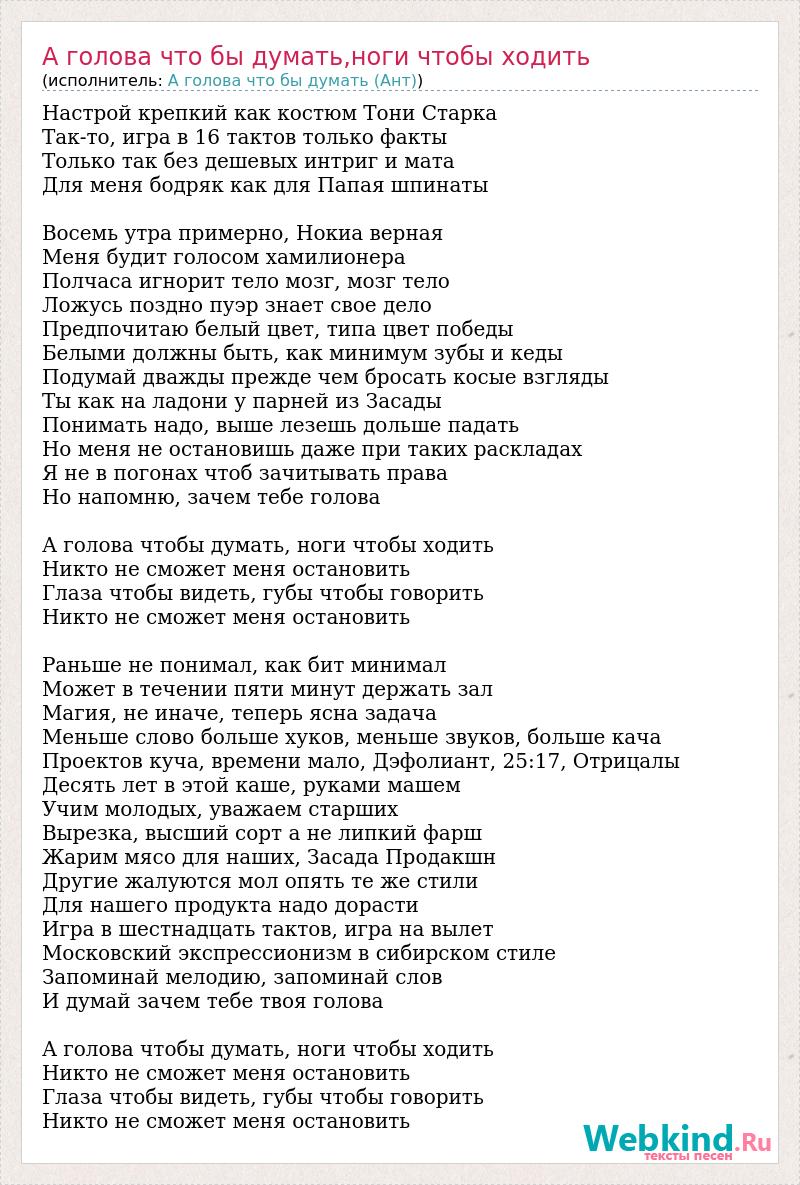 А как ты думаешь, о чем песня "А голова что бы думать,ноги чтобы ходить" ?