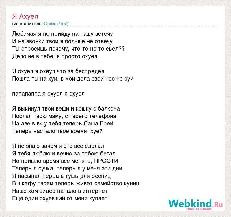 Любимая я не прийду на нашу встечу И на звонки твои я больше не отвечу Ты спросишь почему, что-то не то сьел?? Дело не в тебе, я просто охуел Я охуел я охеул что за беспредел Пошла ты на хуй, в мои дела свой нос не суй папапаппа я охуел я охуел Я выкинул твои вещи и кошку с балкона Послал твою маму, с твоего телефона На аве в вк у тебя теперь Саша Грей Теперь настало твое время хуей Я не знаю зачем я это все сделал Я тебя люблю и вечно за тобою бегал Но пришло время все менять, ПРОСТИ Теперь я сучка, теперь я у меня эти дни, Я насыпал перца в тушь для ресниц В шкафу твоем теперь живет семейство куниц Наше хом видео папало в интернет Еще один охуевший от меня куплет