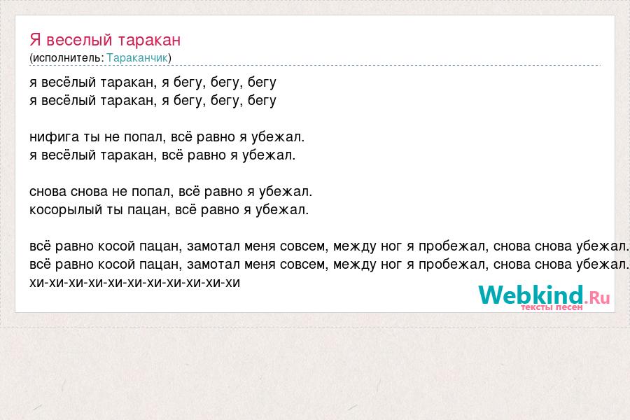 я весёлый таракан, я бегу, бегу, бегу я весёлый таракан, я бегу, бегу, бегу нифига ты не попал, всё равно я убежал. я весёлый таракан, всё равно я убежал. снова снова не попал, всё равно я убежал. косорылый ты пацан, всё равно я убежал. всё равно косой пацан, замотал меня совсем, между ног я пробежал, снова снова убежал. всё равно косой пацан, замотал меня совсем, между ног я пробежал, снова снова убежал. хи-хи-хи-хи-хи-хи-хи-хи-хи-хи-хи