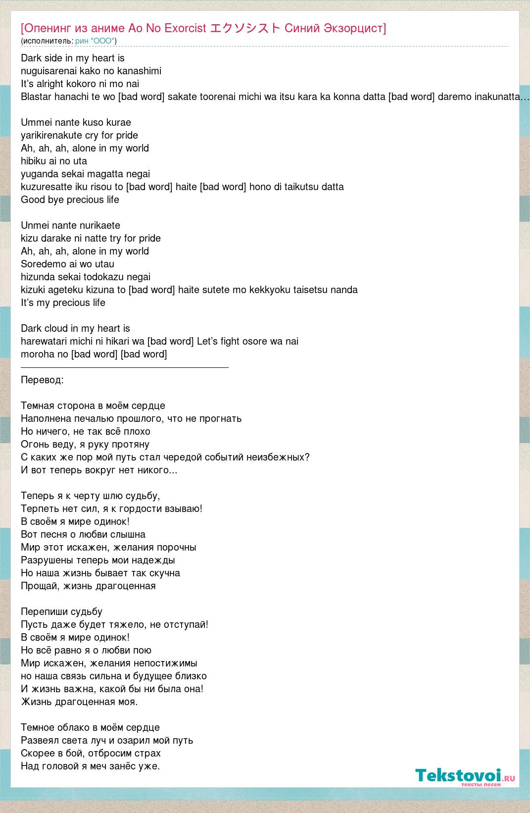 Dark side in my heart is nuguisarenai kako no kanashimi It’s alright kokoro ni mo nai Blastar hanachi te wo [bad word] sakate toorenai michi wa itsu kara ka konna datta [bad word] daremo inakunatta… Ummei nante kuso kurae yarikirenakute cry for pride Ah, ah, ah, alone in my world hibiku ai no uta yuganda sekai magatta negai kuzuresatte iku risou to [bad word] haite suteru hono di taikutsu datta Good bye precious life Unmei nante nurikaete kizu darake ni natte try for pride Ah, ah, ah, alone in my world Soredemo ai wo utau hizunda sekai todokazu negai kizuki ageteku kizuna to [bad word] haite sutete mo kekkyoku taisetsu nanda It’s my precious life Dark cloud in my heart is harewatari michi ni hikari wa [bad word] Let’s fight osore wa nai moroha no tsurugi [bad word] ――――――――――――――――――――― Перевод: Темная сторона в моём сердце Наполнена печалью прошлого, что не прогнать Но ничего, не так всё плохо Огонь веду, я руку протяну С каких же пор мой путь стал чередой событий неизбежных? И вот теперь вокруг нет никого... Теперь я к черту шлю судьбу, Терпеть нет сил, я к гордости взываю! В своём я мире одинок! Вот песня о любви слышна Мир этот искажен, желания порочны Разрушены теперь мои надежды Но наша жизнь бывает так скучна Прощай, жизнь драгоценная Перепиши судьбу Пусть даже будет тяжело, не отступай! В своём я мире одинок! Но всё равно я о любви пою Мир искажен, желания непостижимы но наша связь сильна и будущее близко И жизнь важна, какой бы ни была она! Жизнь драгоценная моя. Темное облако в моём сердце Развеял света луч и озарил мой путь Скорее в бой, отбросим страх Над головой я меч занёс уже.