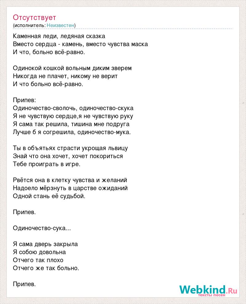Каменная леди, ледяная сказка Вместо сердца - камень, вместо чувства маска И что, больно всё-равно. Одинокой кошкой вольным диким зверем Никогда не плачет, никому не верит И что больно всё-равно. Припев: Одиночество-сволочь, одиночество-скука Я не чувствую сердце,я не чувствую руку Я сама так решила, тишина мне подруга Лучше б я согрешила, одиночество-мука. Ты в объятьях страсти укрощая львицу Знай что она хочет, хочет покориться Тебе проиграть в игре. Рвётся она в клетку чувства и желаний Надоело мёрзнуть в царстве ожиданий Одной стань её судьбой. Припев. Одиночество-сука... Я сама дверь закрыла Я собою довольна Отчего так плохо Отчего же так больно. Припев.