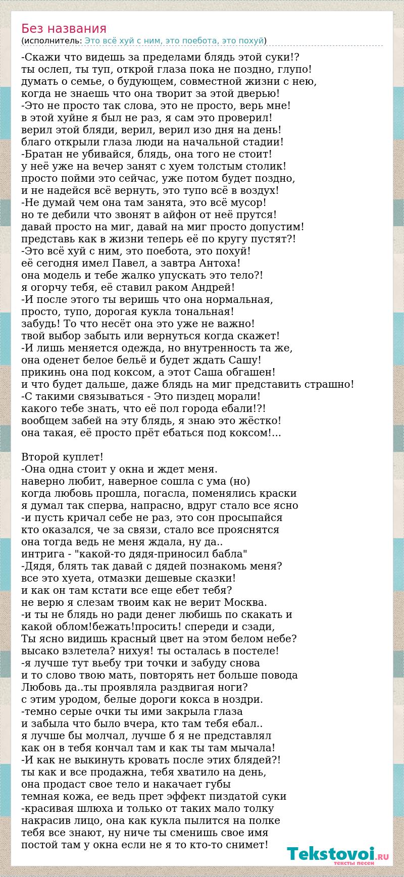 -Скажи что видешь за пределами блядь этой суки!? ты ослеп, ты туп, открой глаза пока не поздно, глупо! думать о семье, о будующем, совместной жизни с нею, когда не знаешь что она творит за этой дверью! -Это не просто так слова, это не просто, верь мне! в этой хуйне я был не раз, я сам это проверил! верил этой бляди, верил, верил изо дня на день! благо открыли глаза люди на начальной стадии! -Братан не убивайся, блядь, она того не стоит! у неё уже на вечер занят с хуем толстым столик! просто пойми это сейчас, уже потом будет поздно, и не надейся всё вернуть, это тупо всё в воздух! -Не думай чем она там занята, это всё мусор! но те дебили что звонят в айфон от неё прутся! давай просто на миг, давай на миг просто допустим! представь как в жизни теперь её по кругу пустят?! -Это всё хуй с ним, это поебота, это похуй! её сегодня имел Павел, а завтра Антоха! она модель и тебе жалко упускать это тело?! я огорчу тебя, её ставил раком Андрей! -И после этого ты веришь что она нормальная, просто, тупо, дорогая кукла тональная! забудь! То что несёт она это уже не важно! твой выбор забыть или вернуться когда скажет! -И лишь меняется одежда, но внутренность та же, она оденет белое бельё и будет ждать Сашу! прикинь она под коксом, а этот Саша обгашен! и что будет дальше, даже блядь на миг представить страшно! -С такими связываться - Это пиздец морали! какого тебе знать, что её пол города ебали!?! вообщем забей на эту блядь, я знаю это жёстко! она такая, её просто прёт ебаться под коксом!... Второй куплет! -Она одна стоит у окна и ждет меня. наверно любит, наверное сошла с ума (но) когда любовь прошла, погасла, поменялись краски я думал так сперва, напрасно, вдруг стало все ясно -и пусть кричал себе не раз, это сон просыпайся кто оказался, че за связи, стало все прояснятся она тогда ведь не меня ждала, ну да.. интрига - "какой-то дядя-приносил бабла" -Дядя, блять так давай с дядей познакомь меня? все это хуета, отмазки дешевые сказки! и как он там кстати все еще ебет тебя? не верю я слезам твоим как не верит Москва. -и ты не блядь но ради денег любишь по скакать и какой облом!бежать!просить! спереди и сзади, Ты ясно видишь красный цвет на этом белом небе? высако взлетела? нихуя! ты осталась в постеле! -я лучше тут вьебу три точки и забуду снова и то слово твою мать, повторять нет больше повода Любовь да..ты проявляла раздвигая ноги? с этим уродом, белые дороги кокса в ноздри. -темно серые очки ты ими закрыла глаза и забыла что было вчера, кто там тебя ебал.. я лучше бы молчал, лучше б я не представлял как он в тебя кончал там и как ты там мычала! -И как не выкинуть кровать после этих блядей?! ты как и все продажна, тебя хватило на день, она продаст свое тело и накачает губы темная кожа, ее ведь прет эффект пиздатой суки -красивая шлюха и только от таких мало толку накрасив лицо, она как кукла пылится на полке тебя все знают, ну ниче ты сменишь свое имя постой там у окна если не я то кто-то снимет!