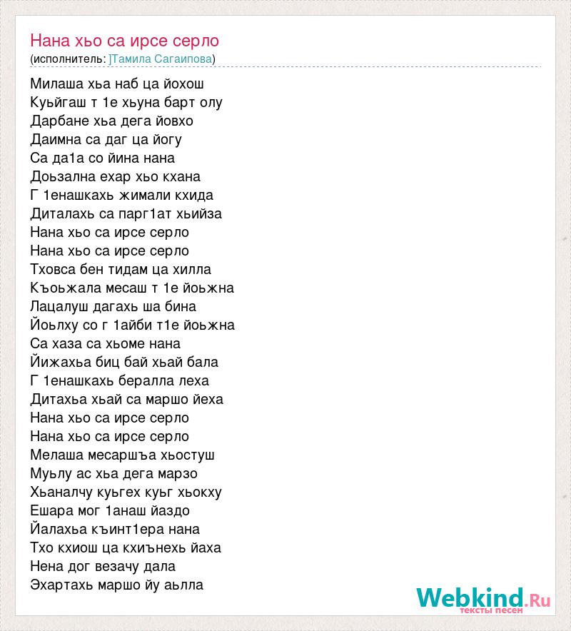 Милаша хьа наб ца йохош Куьйгаш т 1е хьуна барт олу Дарбане хьа дега йовхо Даимна са даг ца йогу Са да1а со йина нана Доьзална ехар хьо кхана Г 1енашкахь жимали кхида Диталахь са парг1ат хьийза Нана хьо са ирсе серло Нана хьо са ирсе серло Тховса бен тидам ца хилла Къоьжала месаш т 1е йоьжна Лацалуш дагахь ша бина Йоьлху со г 1айби т1е йоьжна Са хаза са хьоме нана Йижахьа биц бай хьай бала Г 1енашкахь бералла леха Дитахьа хьай са маршо йеха Нана хьо са ирсе серло Нана хьо са ирсе серло Мелаша месаршъа хьостуш Муьлу ас хьа дега марзо Хьаналчу куьгех куьг хьокху Ешара мог 1анаш йаздо Йалахьа къинт1ера нана Тхо кхиош ца кхиънехь йаха Нена дог везачу дала Эхартахь маршо йу аьлла