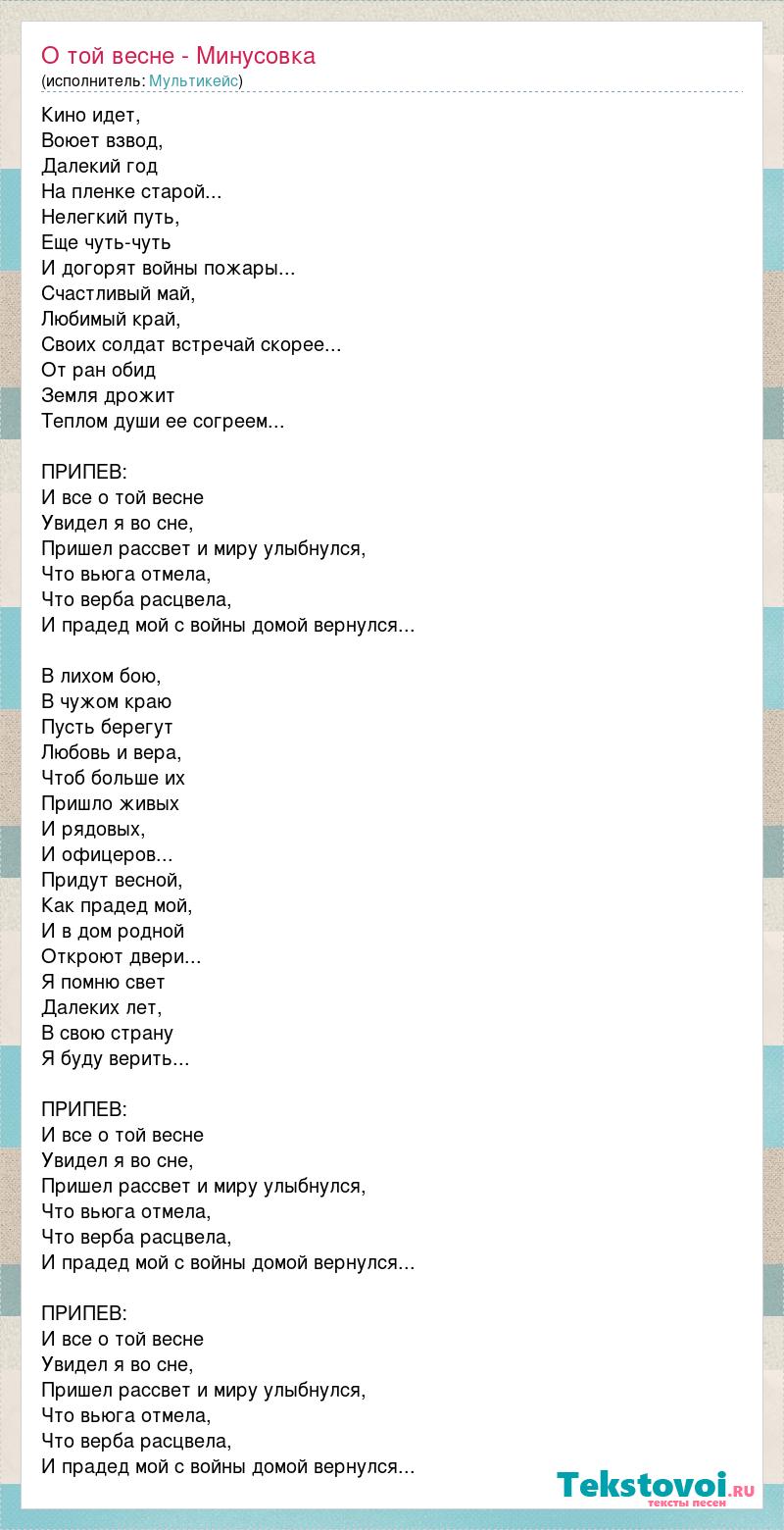 Кино идет, Воюет взвод, Далекий год На пленке старой... Нелегкий путь, Еще чуть-чуть И догорят войны пожары... Счастливый май, Любимый край, Своих солдат встречай скорее... От ран обид Земля дрожит Теплом души ее согреем... ПРИПЕВ: И все о той весне Увидел я во сне, Пришел рассвет и миру улыбнулся, Что вьюга отмела, Что верба расцвела, И прадед мой с войны домой вернулся... В лихом бою, В чужом краю Пусть берегут Любовь и вера, Чтоб больше их Пришло живых И рядовых, И офицеров... Придут весной, Как прадед мой, И в дом родной Откроют двери... Я помню свет Далеких лет, В свою страну Я буду верить... ПРИПЕВ: И все о той весне Увидел я во сне, Пришел рассвет и миру улыбнулся, Что вьюга отмела, Что верба расцвела, И прадед мой с войны домой вернулся... ПРИПЕВ: И все о той весне Увидел я во сне, Пришел рассвет и миру улыбнулся, Что вьюга отмела, Что верба расцвела, И прадед мой с войны домой вернулся...