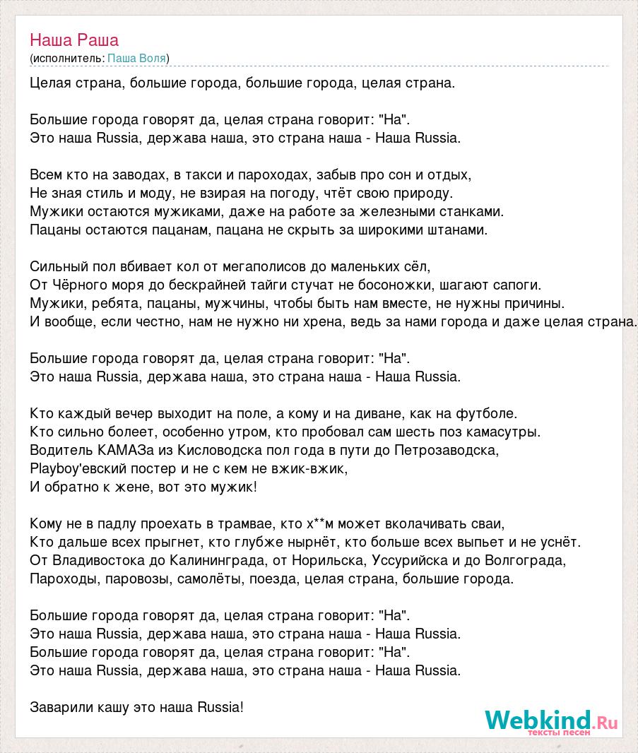 Целая страна, большие города, большие города, целая страна. Большие города говорят да, целая страна говорит: "На". Это наша Russia, держава наша, это страна наша - Наша Russia. Всем кто на заводах, в такси и пароходах, забыв про сон и отдых, Не зная стиль и моду, не взирая на погоду, чтёт свою природу. Мужики остаются мужиками, даже на работе за железными станками. Пацаны остаются пацанам, пацана не скрыть за широкими штанами. Сильный пол вбивает кол от мегаполисов до маленьких сёл, От Чёрного моря до бескрайней тайги стучат не босоножки, шагают сапоги. Мужики, ребята, пацаны, мужчины, чтобы быть нам вместе, не нужны причины. И вообще, если честно, нам не нужно ни хрена, ведь за нами города и даже целая страна. Большие города говорят да, целая страна говорит: "На". Это наша Russia, держава наша, это страна наша - Наша Russia. Кто каждый вечер выходит на поле, а кому и на диване, как на футболе. Кто сильно болеет, особенно утром, кто пробовал сам шесть поз камасутры. Водитель КАМАЗа из Кисловодска пол года в пути до Петрозаводска, Playboy'евский постер и не с кем не вжик-вжик, И обратно к жене, вот это мужик! Кому не в падлу проехать в трамвае, кто х**м может вколачивать сваи, Кто дальше всех прыгнет, кто глубже нырнёт, кто больше всех выпьет и не уснёт. От Владивостока до Калининграда, от Норильска, Уссурийска и до Волгограда, Пароходы, паровозы, самолёты, поезда, целая страна, большие города. Большие города говорят да, целая страна говорит: "На". Это наша Russia, держава наша, это страна наша - Наша Russia. Большие города говорят да, целая страна говорит: "На". Это наша Russia, держава наша, это страна наша - Наша Russia. Заварили кашу это наша Russia!