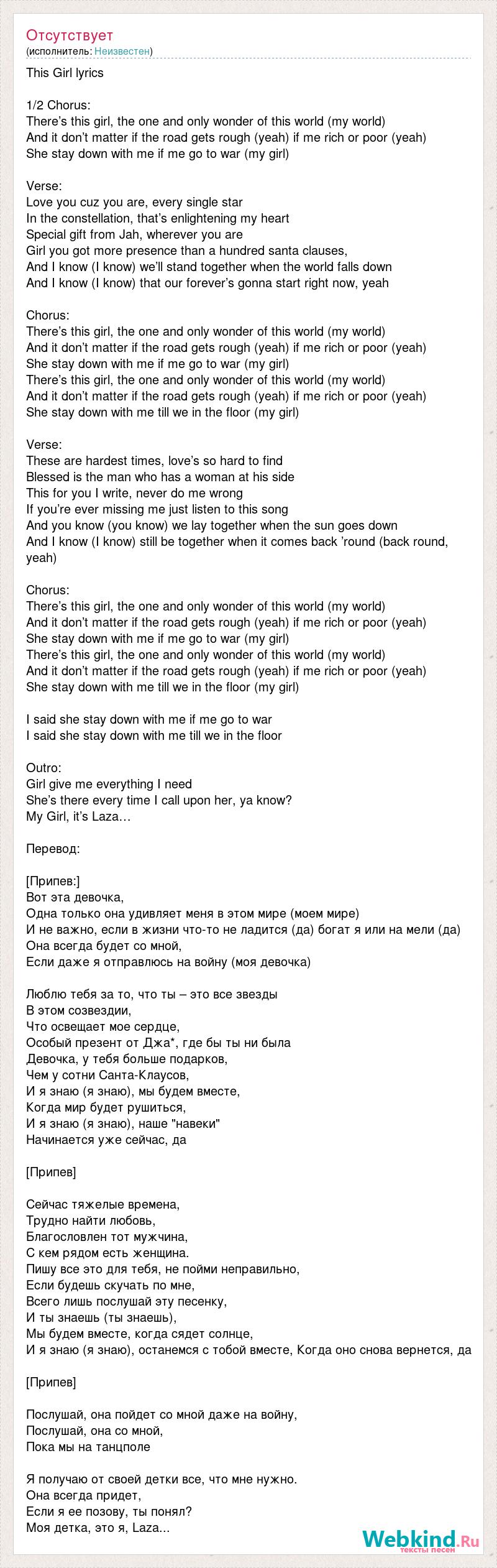 This Girl lyrics 1/2 Chorus: There’s this girl, the one and only wonder of this world (my world) And it don’t matter if the road gets rough (yeah) if me rich or poor (yeah) She stay down with me if me go to war (my girl) Verse: Love you cuz you are, every single star In the constellation, that’s enlightening my heart Special gift from Jah, wherever you are Girl you got more presence than a hundred santa clauses, And I know (I know) we’ll stand together when the world falls down And I know (I know) that our forever’s gonna start right now, yeah Chorus: There’s this girl, the one and only wonder of this world (my world) And it don’t matter if the road gets rough (yeah) if me rich or poor (yeah) She stay down with me if me go to war (my girl) There’s this girl, the one and only wonder of this world (my world) And it don’t matter if the road gets rough (yeah) if me rich or poor (yeah) She stay down with me till we in the floor (my girl) Verse: These are hardest times, love’s so hard to find Blessed is the man who has a woman at his side This for you I write, never do me wrong If you’re ever missing me just listen to this song And you know (you know) we lay together when the sun goes down And I know (I know) still be together when it comes back ’round (back round, yeah) Chorus: There’s this girl, the one and only wonder of this world (my world) And it don’t matter if the road gets rough (yeah) if me rich or poor (yeah) She stay down with me if me go to war (my girl) There’s this girl, the one and only wonder of this world (my world) And it don’t matter if the road gets rough (yeah) if me rich or poor (yeah) She stay down with me till we in the floor (my girl) I said she stay down with me if me go to war I said she stay down with me till we in the floor Outro: Girl give me everything I need She’s there every time I call upon her, ya know? My Girl, it’s Laza… Перевод: [Припев:] Вот эта девочка, Одна только она удивляет меня в этом мире (моем мире) И не важно, если в жизни что-то не ладится (да) богат я или на мели (да) Она всегда будет со мной, Если даже я отправлюсь на войну (моя девочка) Люблю тебя за то, что ты – это все звезды В этом созвездии, Что освещает мое сердце, Особый презент от Джа*, где бы ты ни была Девочка, у тебя больше подарков, Чем у сотни Санта-Клаусов, И я знаю (я знаю), мы будем вместе, Когда мир будет рушиться, И я знаю (я знаю), наше "навеки" Начинается уже сейчас, да [Припев] Сейчас тяжелые времена, Трудно найти любовь, Благословлен тот мужчина, С кем рядом есть женщина. Пишу все это для тебя, не пойми неправильно, Если будешь скучать по мне, Всего лишь послушай эту песенку, И ты знаешь (ты знаешь), Мы будем вместе, когда сядет солнце, И я знаю (я знаю), останемся с тобой вместе, Когда оно снова вернется, да [Припев] Послушай, она пойдет со мной даже на войну, Послушай, она со мной, Пока мы на танцполе Я получаю от своей детки все, что мне нужно. Она всегда придет, Если я ее позову, ты понял? Моя детка, это я, Laza...
