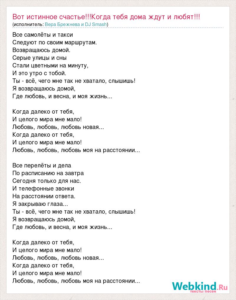 Все самолёты и такси Следуют по своим маршрутам. Возвращаюсь домой. Серые улицы и сны Стали цветными на минуту, И это утро с тобой. Ты - всё, чего мне так не хватало, слышишь! Я возвращаюсь домой, Где любовь, и весна, и моя жизнь... Когда далеко от тебя, И целого мира мне мало! Любовь, любовь, любовь новая... Когда далеко от тебя, И целого мира мне мало! Любовь, любовь, любовь моя на расстоянии... Все перелёты и дела По расписанию на завтра Сегодня только для нас. И телефонные звонки На расстоянии ответа. Я закрываю глаза... Ты - всё, чего мне так не хватало, слышишь! Я возвращаюсь домой, Где любовь, и весна, и моя жизнь... Когда далеко от тебя, И целого мира мне мало! Любовь, любовь, любовь новая... Когда далеко от тебя, И целого мира мне мало! Любовь, любовь, любовь моя на расстоянии...