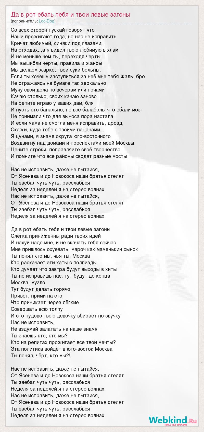 Со всех сторон пускай говорят что Наши прожигают года, но нас не исправить Кричат любимый, синяки под глазами, На отходах...а я видел твою любимую в хлам И не меньше чем ты, переходя черты Мы вышибли черты, правила и жанры Мы делаем жарко, твои суки больны, Если ты хочешь заступиться за неё мне тебя жаль, бро Не отражаясь на бумаге так зеркально Мучу свои дела по вечерам или ночами Качаю столько, своих качаю заново На репите играю у ваших дам, бля И пусть это банально, но все балаболы что ебали мозг Не понимали что для выноса пора настала И если мама не смогла меня исправить, дрозд, Скажи, куда тебе с твоими пацанами... Я цунами, я знамя округа юго-восточного Воздвигну над домами и проспектами моей Москвы Цените строки, поправляйте своё творчество И помните что все районы сводят разные мосты Нас не исправить, даже не пытайся, От Ясенева и до Новокоса наши братья стелят Ты заебал чуть чуть, расслабься Неделя за неделей я на стерео волнах Нас не исправить, даже не пытайся, От Ясенева и до Новокоса наши братья стелят Ты заебал чуть чуть, расслабься Неделя за неделей я на стерео волнах Да в рот ебать тебя и твои левые загоны Слегка приниженны ради твоих идей И нахуй надо мне, и не вкачать тебя сейчас Мне пришлось охуевать, мароч как маменькин сынок Ты понял кто мы, чья ты, Москва Кто раскачает эти хаты с полпизды Кто думает что завтра будут выходы в хиты Ты не исправишь нас, тут будут до конца Москва, музло Тут будут делать горячо Привет, прими на сто Что приникает через лёгкие Совершать всю толпу И сто пудово твою девочку вбирает по звучку Нас не исправить, Не вздумай залатать на наше знамя Ты знаешь кто, кто мы? Кто на репитах прожигает все твои мечты? Эта политика войдёт в юго-восток Москва Ты понял, чёрт, кто мы?! Нас не исправить, даже не пытайся, От Ясенева и до Новокоса наши братья стелят Ты заебал чуть чуть, расслабься Неделя за неделей я на стерео волнах Нас не исправить, даже не пытайся, От Ясенева и до Новокоса наши братья стелят Ты заебал чуть чуть, расслабься Неделя за неделей я на стерео волнах