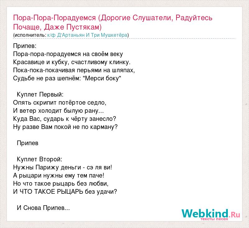 Припев: Пора-пора-порадуемся на своём веку Красавице и кубку, счастливому клинку. Пока-пока-покачивая перьями на шляпах, Судьбе не раз шепнём: "Мерси боку" Куплет Первый: Опять скрипит потёртое седло, И ветер холодит былую рану... Куда Вас, сударь к чёрту занесло? Ну разве Вам покой не по карману? Припев Куплет Второй: Нужны Парижу деньги - сэ ля ви! А рыцари нужны ему тем паче! Но что такое рыцарь без любви, И ЧТО ТАКОЕ РЫЦАРЬ без удачи? И Снова Припев...