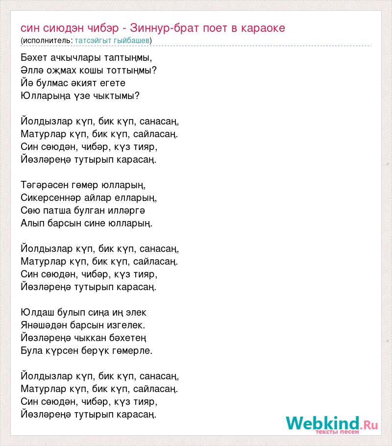 Бәхет ачкычлары таптыңмы, Әллә оҗмах кошы тоттыңмы? Йә булмас әкият егете Юлларыңа үзе чыктымы? Йолдызлар күп, бик күп, санасаң, Матурлар күп, бик күп, сайласаң. Син сөюдән, чибәр, күз тияр, Йөзләреңә тутырып карасаң. Тәгәрәсен гөмер юлларың, Сикерсеннәр айлар елларың, Сөю патша булган илләргә Алып барсын сине юлларың. Йолдызлар күп, бик күп, санасаң, Матурлар күп, бик күп, сайласаң. Син сөюдән, чибәр, күз тияр, Йөзләреңә тутырып карасаң. Юлдаш булып сиңа иң элек Янәшәдән барсын изгелек. Йөзләреңә чыккан бәхетең Була күрсен берүк гөмерле. Йолдызлар күп, бик күп, санасаң, Матурлар күп, бик күп, сайласаң. Син сөюдән, чибәр, күз тияр, Йөзләреңә тутырып карасаң.