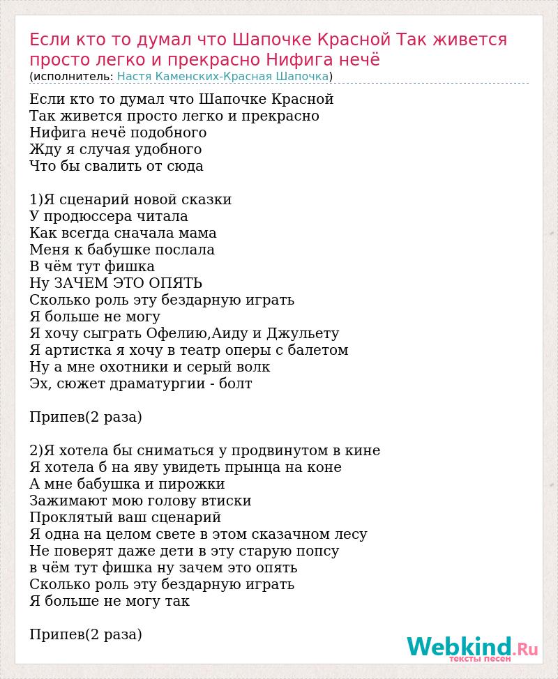 Главная→Исполнители→Настя Каменских-Красная Шапочка→Если кто то думал что Шапочке Красной Так живется просто легко и прекрасно