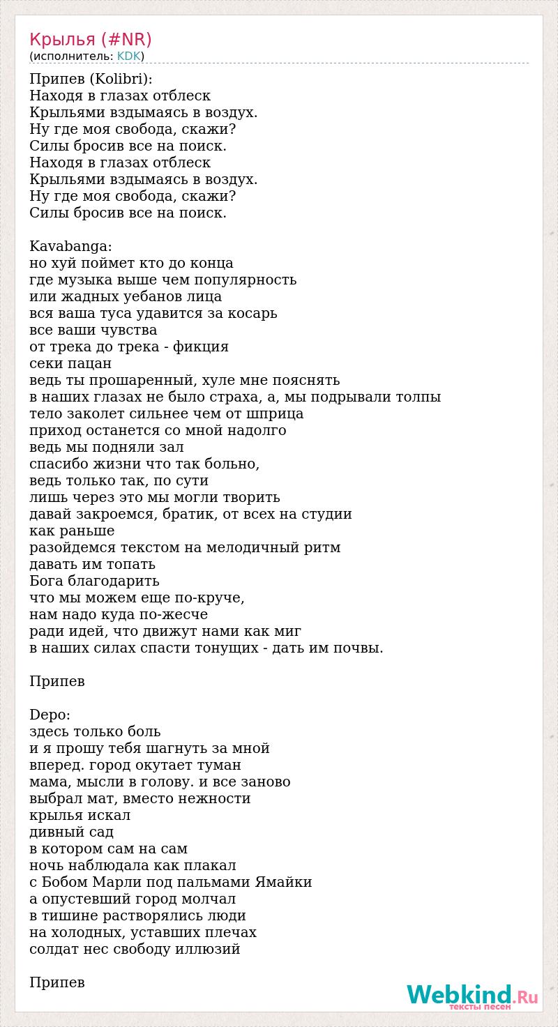 Припев (Kolibri): Находя в глазах отблеск Крыльями вздымаясь в воздух. Ну где моя свобода, скажи? Силы бросив все на поиск. Находя в глазах отблеск Крыльями вздымаясь в воздух. Ну где моя свобода, скажи? Силы бросив все на поиск. Kavabanga: но хуй поймет кто до конца где музыка выше чем популярность или жадных уебанов лица вся ваша туса удавится за косарь все ваши чувства от трека до трека - фикция секи пацан ведь ты прошаренный, хуле мне пояснять в наших глазах не было страха, а, мы подрывали толпы тело заколет сильнее чем от шприца приход останется со мной надолго ведь мы подняли зал спасибо жизни что так больно, ведь только так, по сути лишь через это мы могли творить давай закроемся, братик, от всех на студии как раньше разойдемся текстом на мелодичный ритм давать им топать Бога благодарить что мы можем еще по-круче, нам надо куда по-жесче ради идей, что движут нами как миг в наших силах спасти тонущих - дать им почвы. Припев Depo: здесь только боль и я прошу тебя шагнуть за мной вперед. город окутает туман мама, мысли в голову. и все заново выбрал мат, вместо нежности крылья искал дивный сад в котором сам на сам ночь наблюдала как плакал с Бобом Марли под пальмами Ямайки а опустевший город молчал в тишине растворялись люди на холодных, уставших плечах солдат нес свободу иллюзий Припев