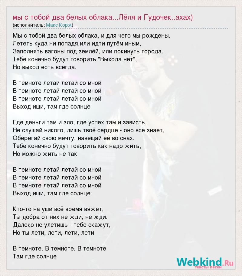 Мы с тобой два белых облака, и для чего мы рождены. Лететь куда ни попадя,или идти путём иным, Заполнять вагоны под землёй, или покинуть города. Тебе конечно будут говорить "Выхода нет", Но выход есть всегда. В темноте летай летай со мной В темноте летай летай со мной В темноте летай летай со мной Выход ищи, там где солнце Где деньги там и зло, где успех там и зависть, Не слушай никого, лишь твоё сердце - оно всё знает, Оберегай свою мечту, навещай её во снах. Тебе конечно будут говорить как надо жить, Но можно жить не так В темноте летай летай со мной В темноте летай летай со мной В темноте летай летай со мной Выход ищи, там где солнце Кто-то на уши всё время вяжет, Ты добра от них не жди, не жди. Далеко не улетишь - тебе скажут, Но ты лети, лети, лети, лети В темноте. В темноте. В темноте Там где солнце