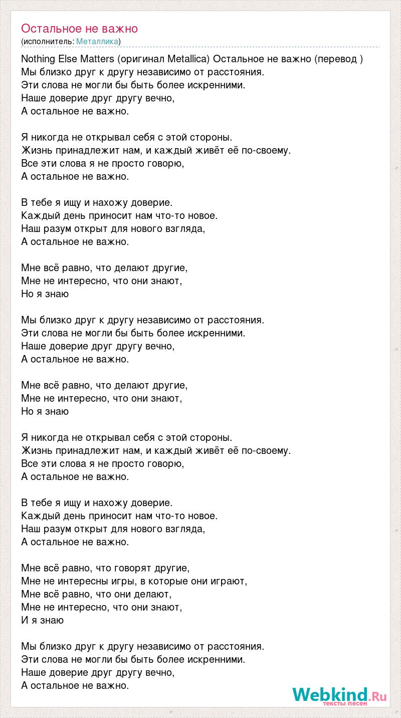 Nothing Else Matters (оригинал Metallica) Остальное не важно (перевод ) Мы близко друг к другу независимо от расстояния. Эти слова не могли бы быть более искренними. Наше доверие друг другу вечно, А остальное не важно. Я никогда не открывал себя с этой стороны. Жизнь принадлежит нам, и каждый живёт её по-своему. Все эти слова я не просто говорю, А остальное не важно. В тебе я ищу и нахожу доверие. Каждый день приносит нам что-то новое. Наш разум открыт для нового взгляда, А остальное не важно. Мне всё равно, что делают другие, Мне не интересно, что они знают, Но я знаю Мы близко друг к другу независимо от расстояния. Эти слова не могли бы быть более искренними. Наше доверие друг другу вечно, А остальное не важно. Мне всё равно, что делают другие, Мне не интересно, что они знают, Но я знаю Я никогда не открывал себя с этой стороны. Жизнь принадлежит нам, и каждый живёт её по-своему. Все эти слова я не просто говорю, А остальное не важно. В тебе я ищу и нахожу доверие. Каждый день приносит нам что-то новое. Наш разум открыт для нового взгляда, А остальное не важно. Мне всё равно, что говорят другие, Мне не интересны игры, в которые они играют, Мне всё равно, что они делают, Мне не интересно, что они знают, И я знаю Мы близко друг к другу независимо от расстояния. Эти слова не могли бы быть более искренними. Наше доверие друг другу вечно, А остальное не важно.