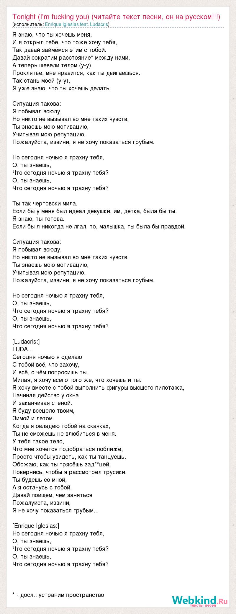 Я знаю, что ты хочешь меня, И я открыл тебе, что тоже хочу тебя, Так давай займёмся этим с тобой. Давай сократим расстояние* между нами, А теперь шевели телом (у-у), Проклятье, мне нравится, как ты двигаешься. Так стань моей (у-у), Я уже знаю, что ты хочешь делать. Ситуация такова: Я побывал всюду, Но никто не вызывал во мне таких чувств. Ты знаешь мою мотивацию, Учитывая мою репутацию. Пожалуйста, извини, я не хочу показаться грубым. Но сегодня ночью я трахну тебя, О, ты знаешь, Что сегодня ночью я трахну тебя? О, ты знаешь, Что сегодня ночью я трахну тебя? Ты так чертовски мила. Если бы у меня был идеал девушки, им, детка, была бы ты. Я знаю, ты готова. Если бы я никогда не лгал, то, малышка, ты была бы правдой. Ситуация такова: Я побывал всюду, Но никто не вызывал во мне таких чувств. Ты знаешь мою мотивацию, Учитывая мою репутацию. Пожалуйста, извини, я не хочу показаться грубым. Но сегодня ночью я трахну тебя, О, ты знаешь, Что сегодня ночью я трахну тебя? О, ты знаешь, Что сегодня ночью я трахну тебя? [Ludacris:] LUDA... Сегодня ночью я сделаю С тобой всё, что захочу, И всё, о чём попросишь ты. Милая, я хочу всего того же, что хочешь и ты. Я хочу вместе с тобой выполнить фигуры высшего пилотажа, Начиная действо у окна И заканчивая стеной. Я буду всецело твоим, Зимой и летом. Когда я овладею тобой на скачках, Ты не сможешь не влюбиться в меня. У тебя такое тело, Что мне хочется подобраться поближе, Просто чтобы увидеть, как ты танцуешь. Обожаю, как ты трясёшь зад**цей, Повернись, чтобы я рассмотрел трусики. Ты будешь со мной, А я останусь с тобой. Давай поищем, чем заняться Пожалуйста, извини, Я не хочу показаться грубым... [Enrique Iglesias:] Но сегодня ночью я трахну тебя, О, ты знаешь, Что сегодня ночью я трахну тебя? О, ты знаешь, Что сегодня ночью я трахну тебя? * - досл.: устраним пространство
