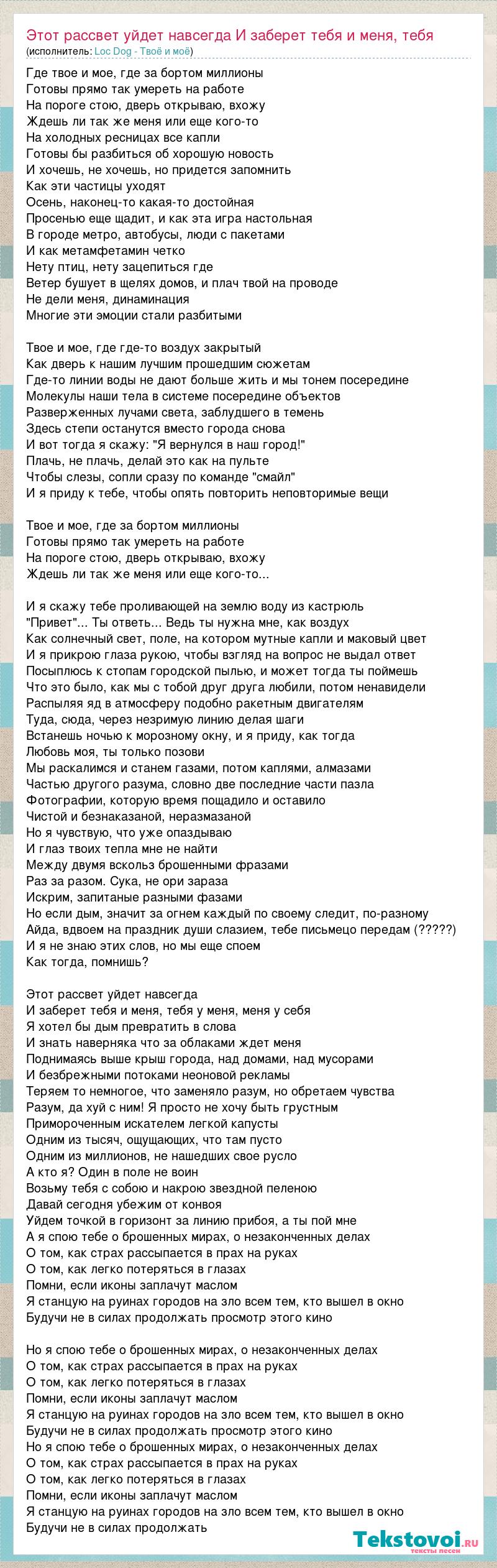 Главная→Исполнители→Loc Dog - Твоё и моё→Этот рассвет уйдет навсегда И заберет тебя и меня, тебя у меня, меня у себя
