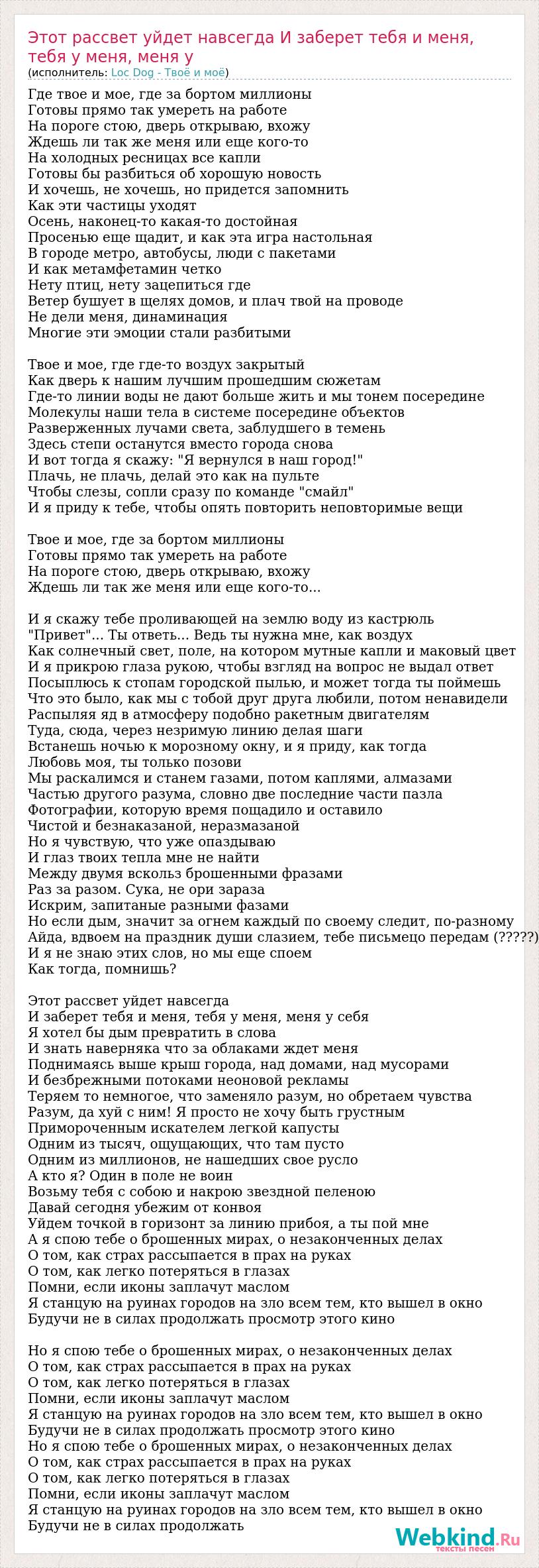 Главная→Исполнители→Loc Dog - Твоё и моё→Этот рассвет уйдет навсегда И заберет тебя и меня, тебя у меня, меня у