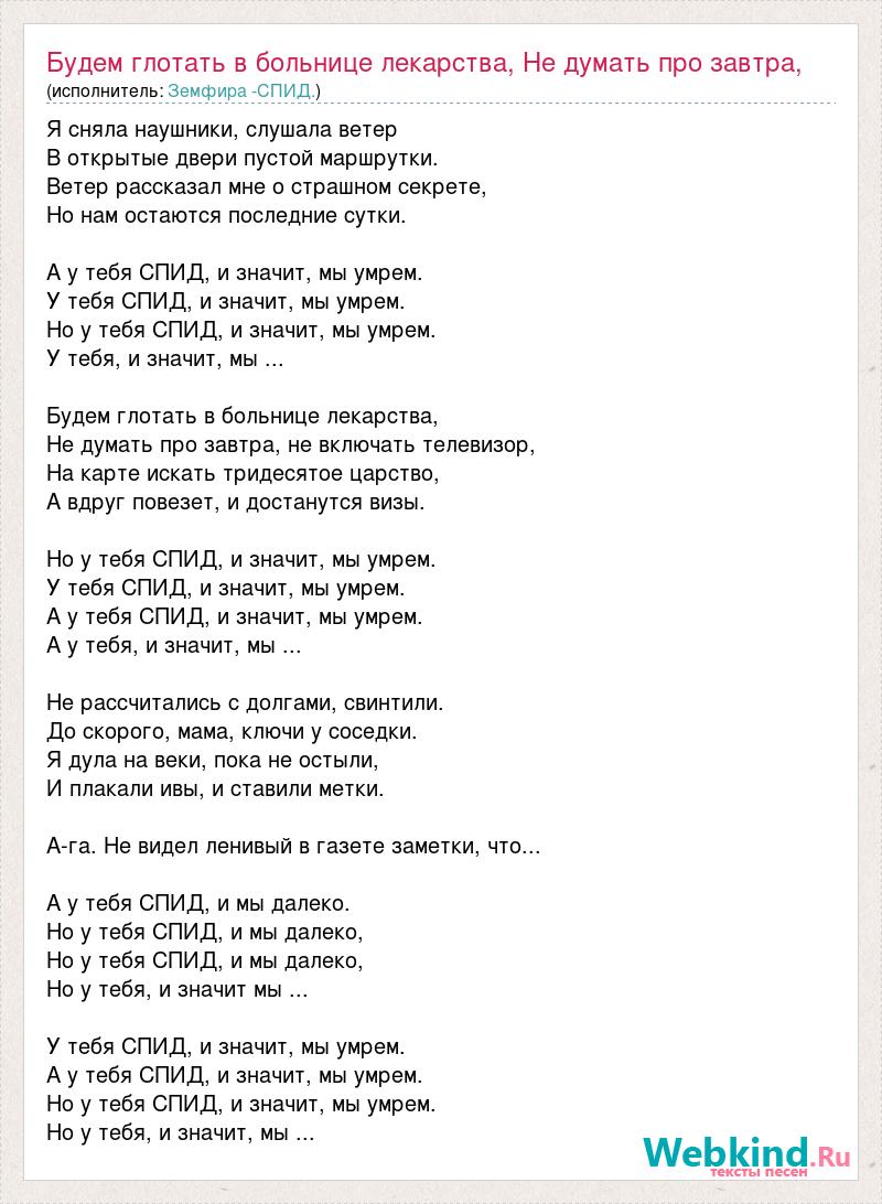 Я сняла наушники, слушала ветер В открытые двери пустой маршрутки. Ветер рассказал мне о страшном секрете, Но нам остаются последние сутки. А у тебя СПИД, и значит, мы умрем. У тебя СПИД, и значит, мы умрем. Но у тебя СПИД, и значит, мы умрем. У тебя, и значит, мы ... Будем глотать в больнице лекарства, Не думать про завтра, не включать телевизор, На карте искать тридесятое царство, А вдруг повезет, и достанутся визы. Но у тебя СПИД, и значит, мы умрем. У тебя СПИД, и значит, мы умрем. А у тебя СПИД, и значит, мы умрем. А у тебя, и значит, мы ... Не рассчитались с долгами, свинтили. До скорого, мама, ключи у соседки. Я дула на веки, пока не остыли, И плакали ивы, и ставили метки. А-га. Не видел ленивый в газете заметки, что... А у тебя СПИД, и мы далеко. Но у тебя СПИД, и мы далеко, Но у тебя СПИД, и мы далеко, Но у тебя, и значит мы ... У тебя СПИД, и значит, мы умрем. А у тебя СПИД, и значит, мы умрем. Но у тебя СПИД, и значит, мы умрем. Но у тебя, и значит, мы ...